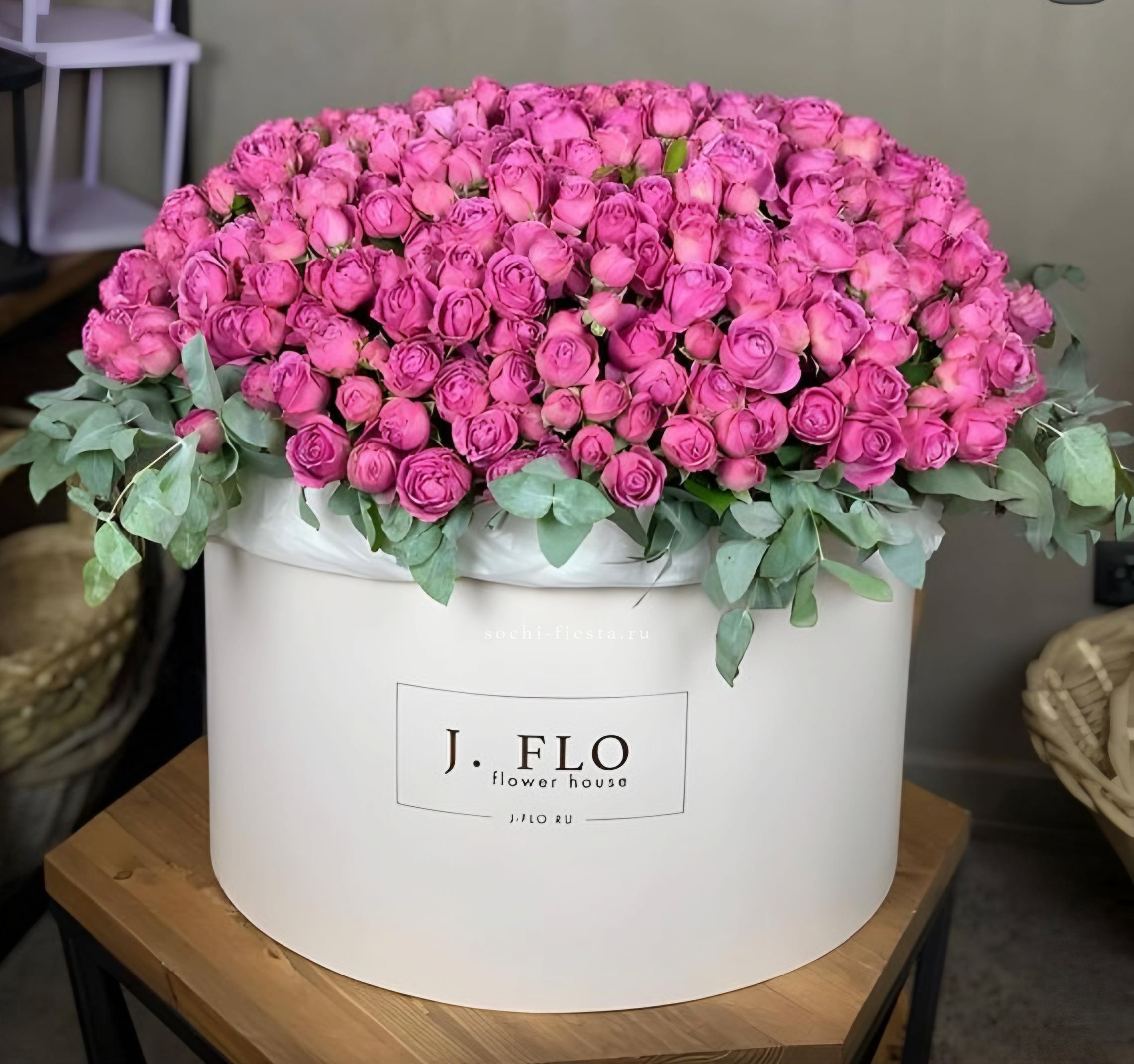 Тысяча и одна роза собраны в объёмную корзину, где каждый белоснежный бутон создаёт плотное облако лепестков. Это композиция, которая заполняет пространство и меняет восприятие комнаты одним своим присутствием.