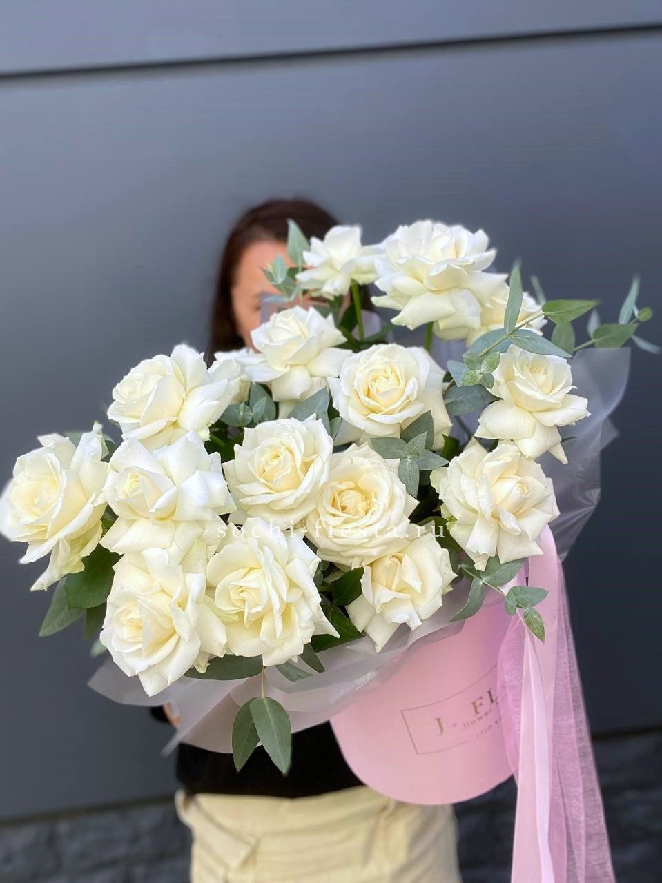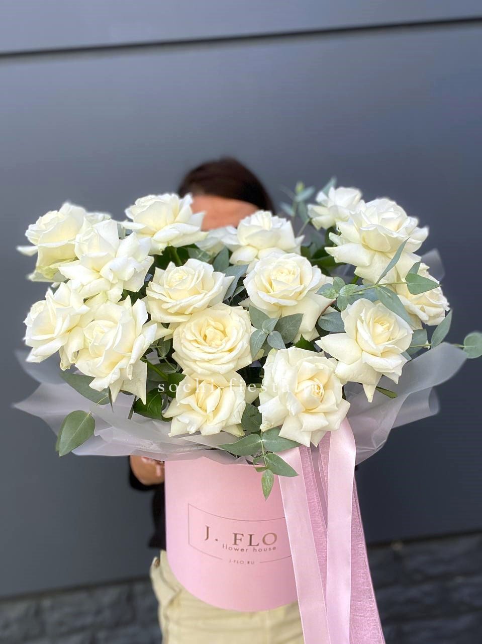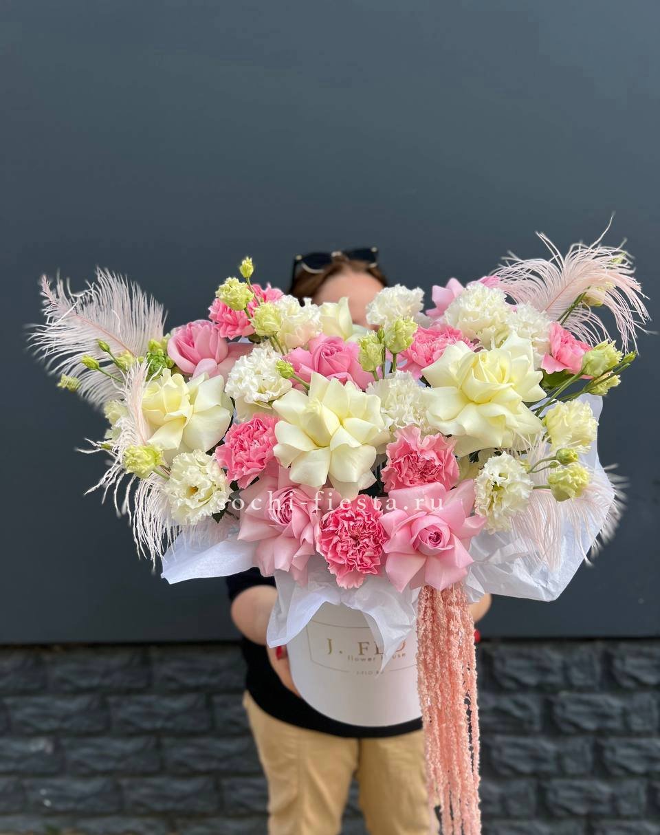 Сто один бутон кенийского пионовидного сорта собраны в масштабную композицию. Белая окантовка лепестков переходит в розовый центр. Впечатляющее присутствие в любом пространстве.