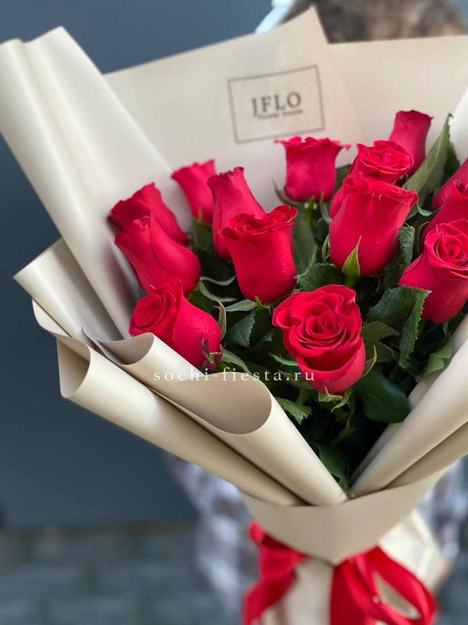Классическая красная роза в лаконичной латте пленке — для тех, кто ценит чистоту формы. Пятнадцать стеблей держат ровный ритм и не перегружают образ. Простота, которая всегда работает.
