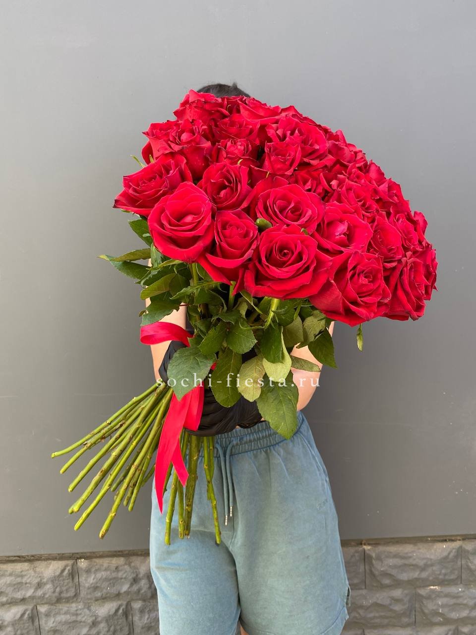 35 красных роз под ленту.