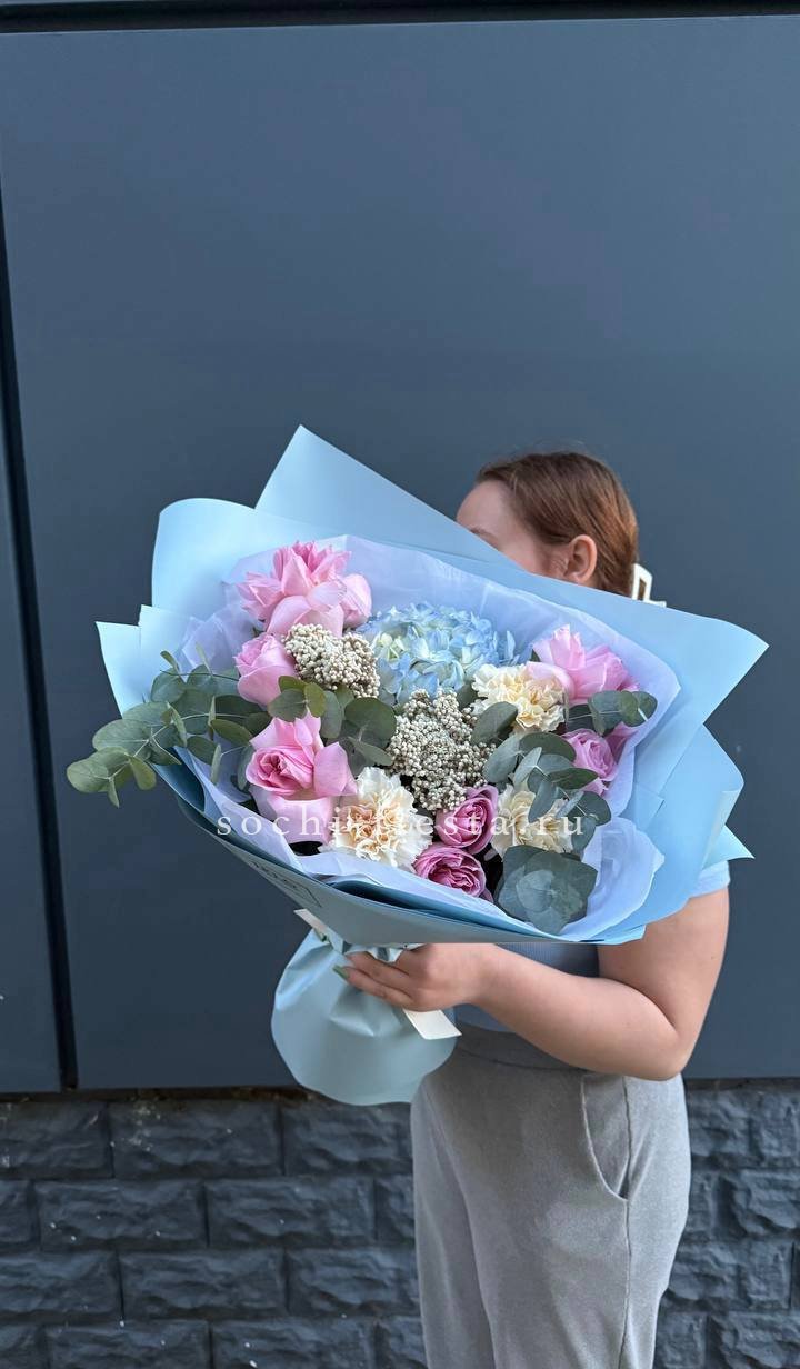 Пять крупных соцветий гортензии в бело-розовой гамме образуют воздушную композицию с переливами света на лепестках. Букет выглядит объёмно и свежо, наполняя пространство мягким цветом.