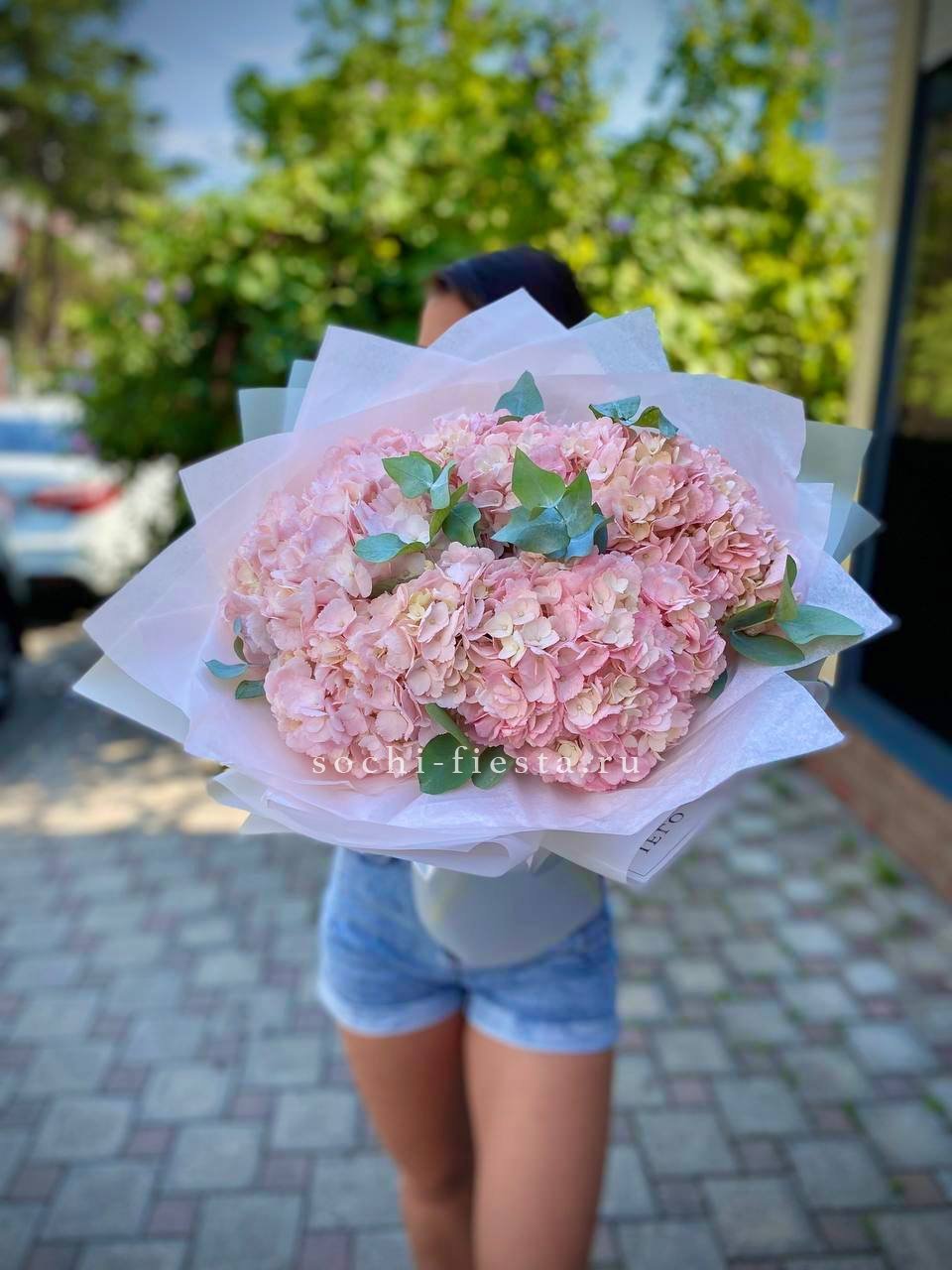 Пять соцветий розовой гортензии в обрамлении матовых веточек эвкалипта. Сочная палитра и продуманная форма делают этот букет удобным для размещения даже в компактном пространстве.