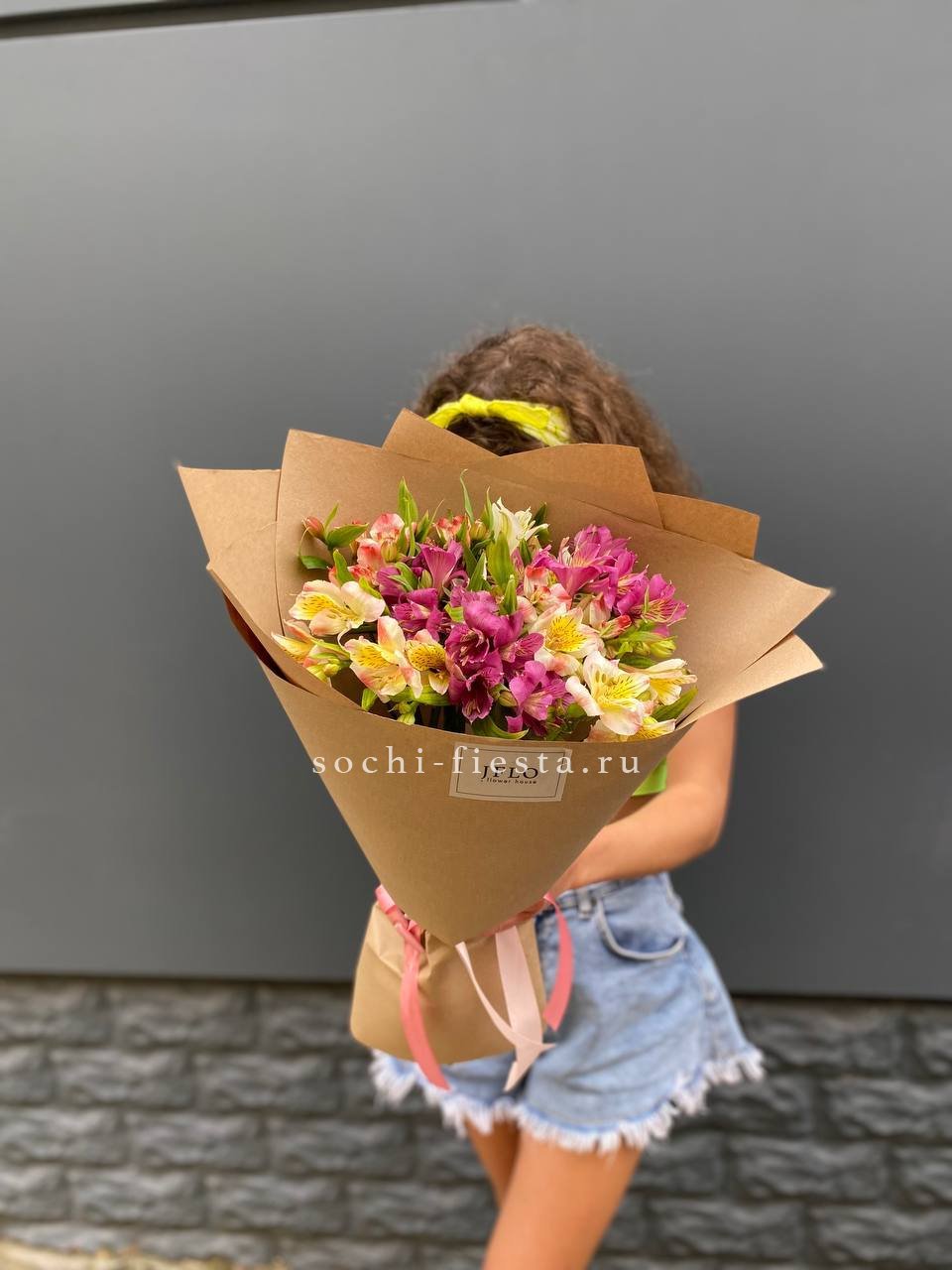 Девять веток альстромерий собраны в свободную композицию и обернуты натуральным крафтом. Естественная форма с лёгким наклоном линий создаёт живое и непринуждённое впечатление.