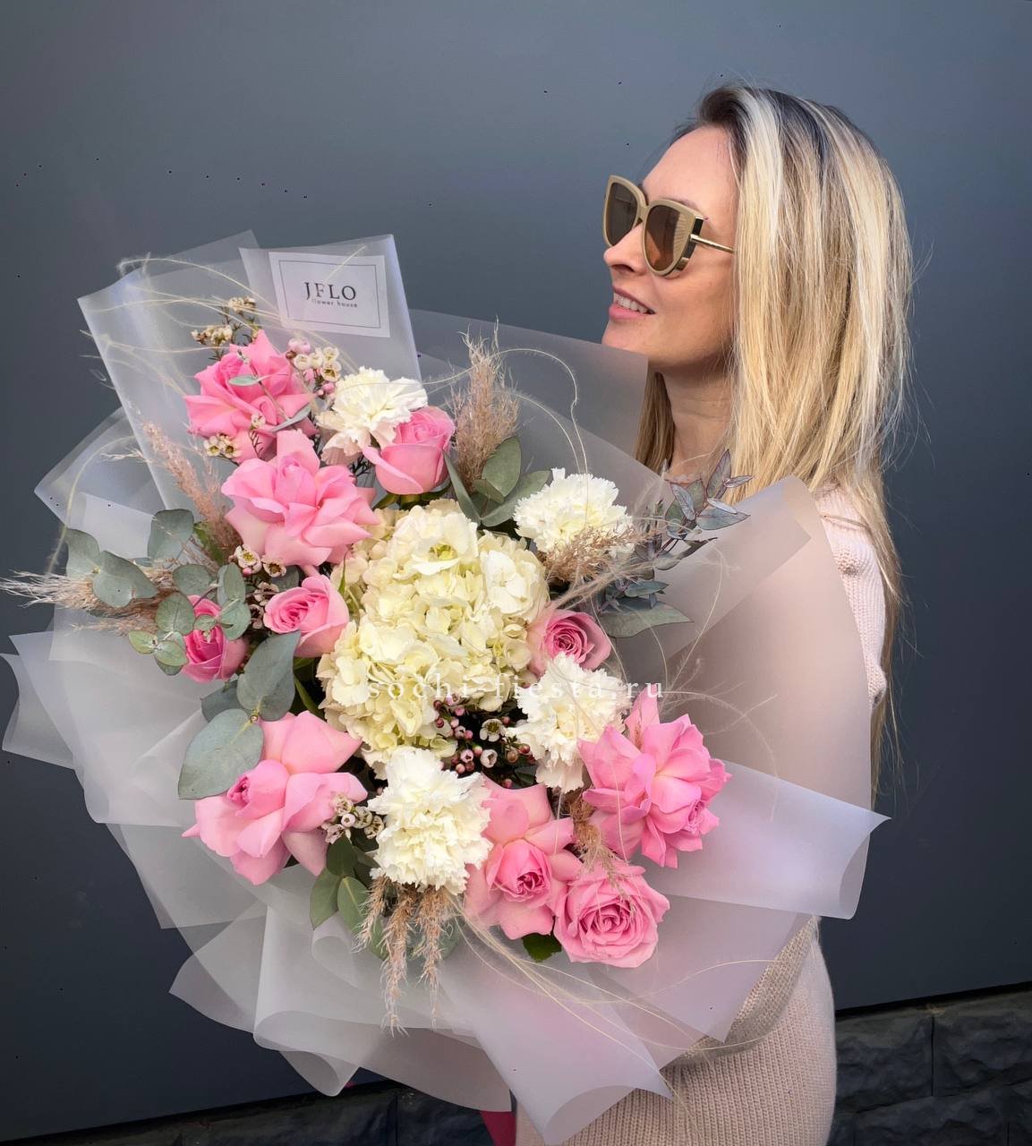 Гортензия и пионовидные розы создают густую округлую форму с мягкими переходами оттенков. Диантус добавляет воздушные вкрапления между крупными бутонами. Композиция в сумке-кашпо держит силуэт и выглядит цельно.