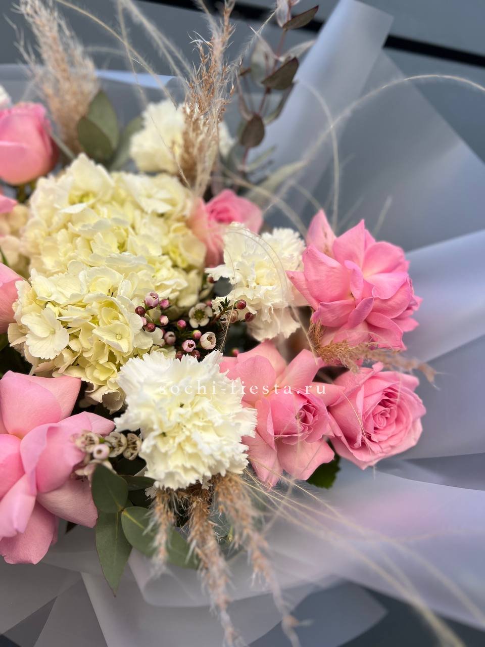 гортензия, розовые розы, пионовидные розы, диантус, эвкалипт, лента, сумка-кашпо.