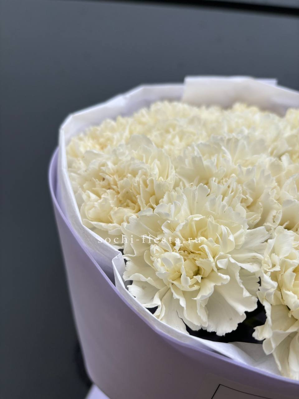Белоснежные диантусы раскрываются плотными многослойными бутонами с резными краями лепестков. Каждый цветок создаёт объёмную текстуру и игру света на поверхности.