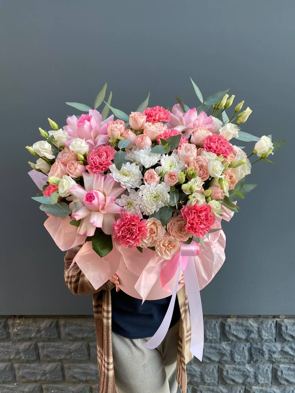Пышная композиция в круглом боксе объединяет розы, эустому, хризантемы и диантус в плотную цветущую массу. Бомбастик добавляет объёма, а эвкалипт смягчает переходы между соцветиями. Готовое решение для размещения на столе или комоде.
