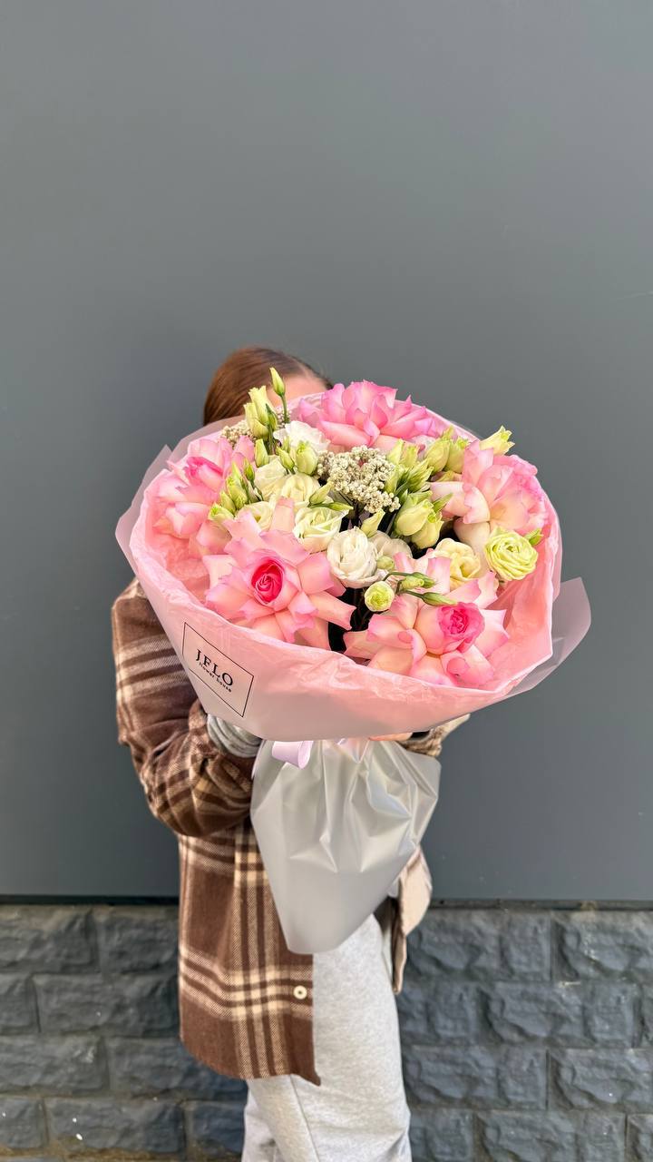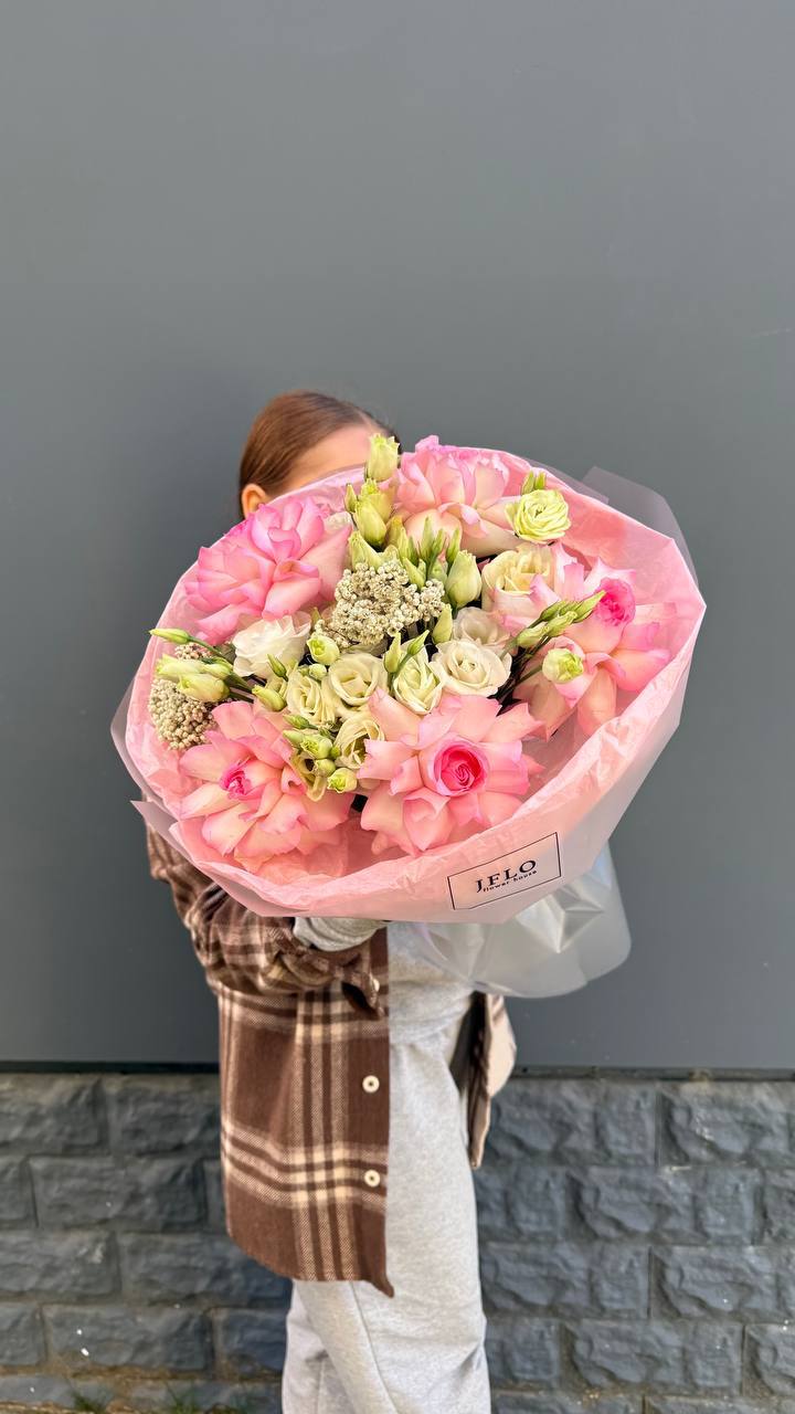 Розовые оттенки роз и эустомы переплетаются с яркой хризантемой в теплой композиции. Хлопок добавляет текстурной мягкости, а озотамус создает ажурную основу. Букет дарит радостное настроение и естественную красоту.