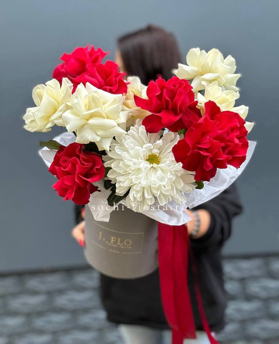 Белые розы, герберы и соцветия гортензии образуют плотную композицию с чёткими линиями. Эустома добавляет воздуха между крупными бутонами, а дизайнерская упаковка завершает форму.