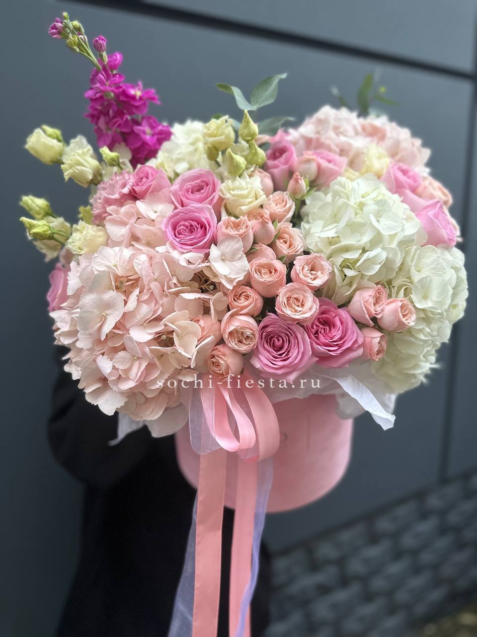Двадцать девять соцветий гортензии образуют воздушное облако пастельных оттенков. Объёмная композиция заполняет пространство мягкими полусферами и создаёт ощущение летней прохлады в любом интерьере.