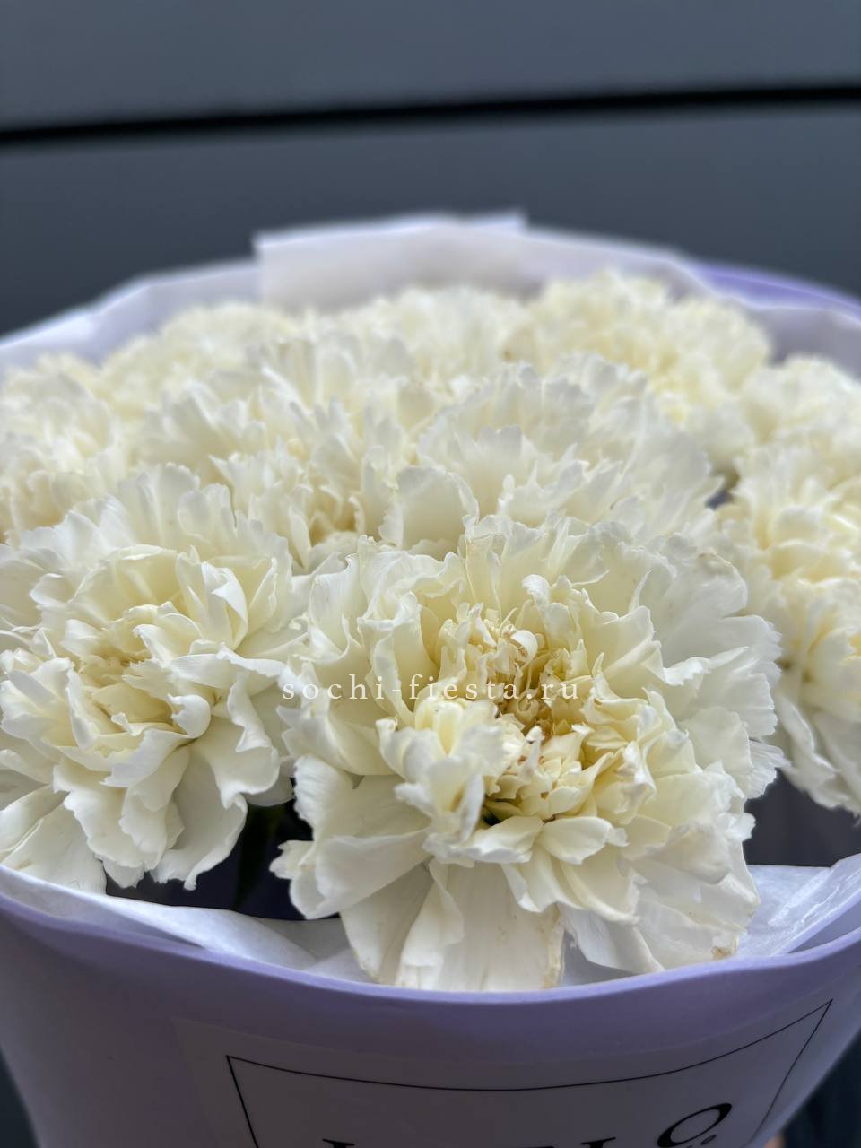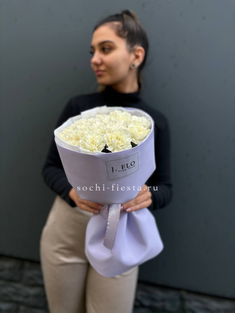 Семь кремовых диантусов раскрываются мягкими многослойными головками. Эвкалипт добавляет воздуха между бутонами и создает легкую асимметрию в общей форме.