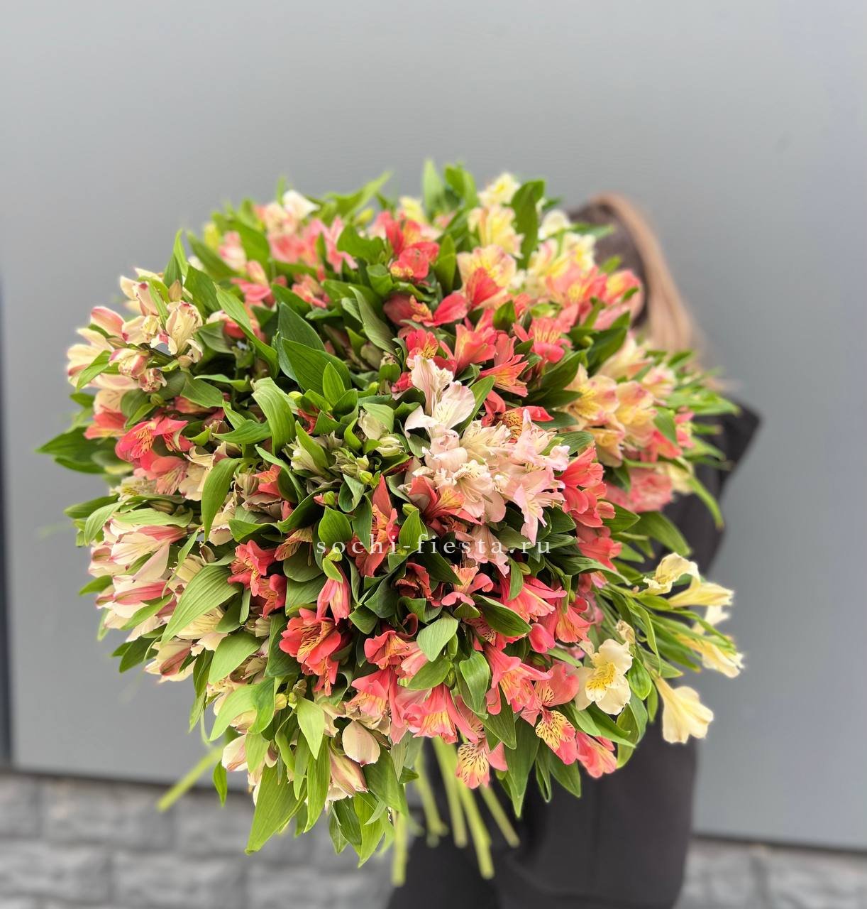 Пятьдесят одна ветка альстромерий — это масштабная композиция с выраженным визуальным присутствием. Букет заполняет пространство и привлекает внимание своим объёмом.