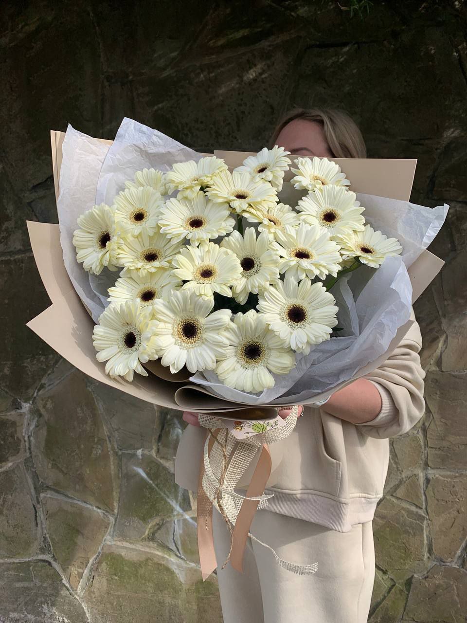 голландская гербера 21 шт., лента, дизайнерская упаковка Оттенок гербер может быть согласован с заказчиком.
