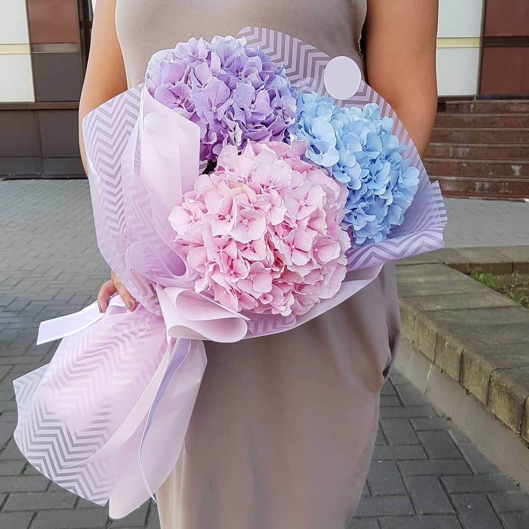 Три крупных соцветия гортензии собраны в лаконичный букет с чёткой архитектурой. Простая форма и природная фактура лепестков раскрывают красоту без лишних деталей.