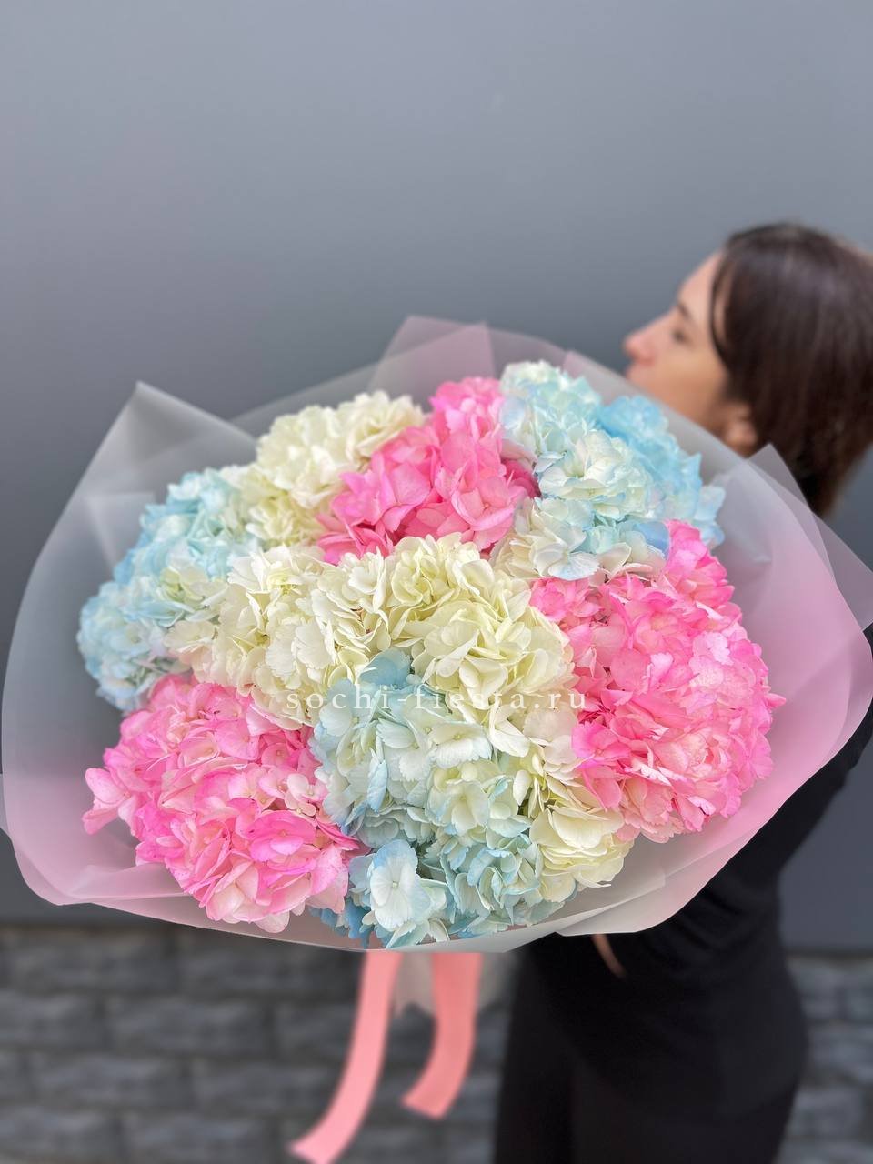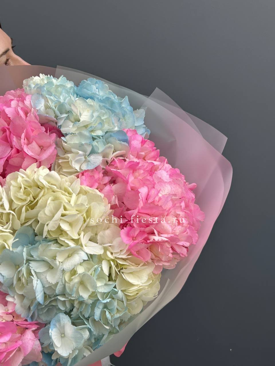 Розовые и голубые соцветия собраны в свободную композицию, где каждая гортензия сохраняет свою индивидуальность. Семь крупных головок формируют выразительный объём с естественной фактурой.
