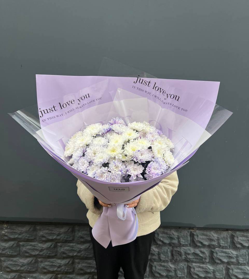 Девять пышных хризантем с переходом от сиреневого к белому собраны в аккуратную композицию. Лавандовая упаковка дополняет холодную гамму и создаёт цельное впечатление. Букет хорошо держит форму и подходит для размещения в высокой вазе.