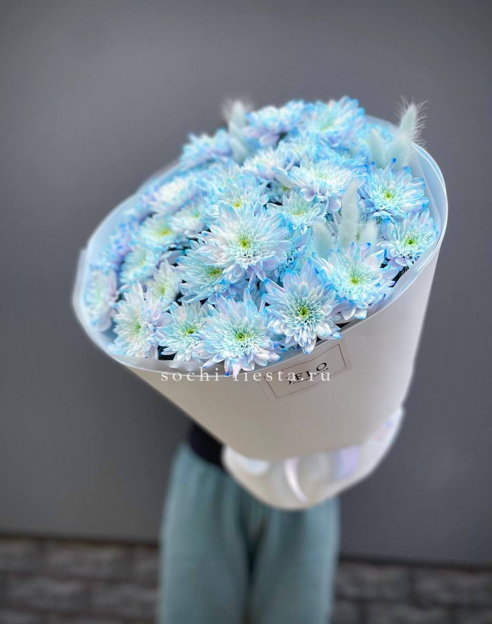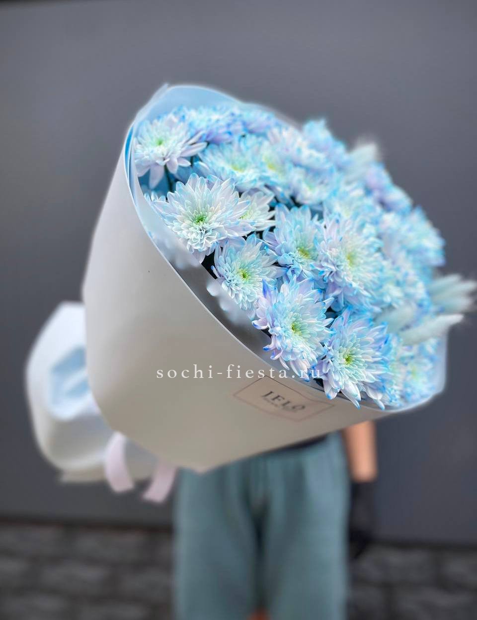 минимальный состав: 7 одноголовых хризантем, лента, упаковка на выбор.