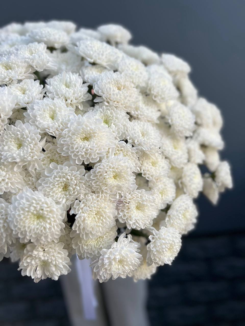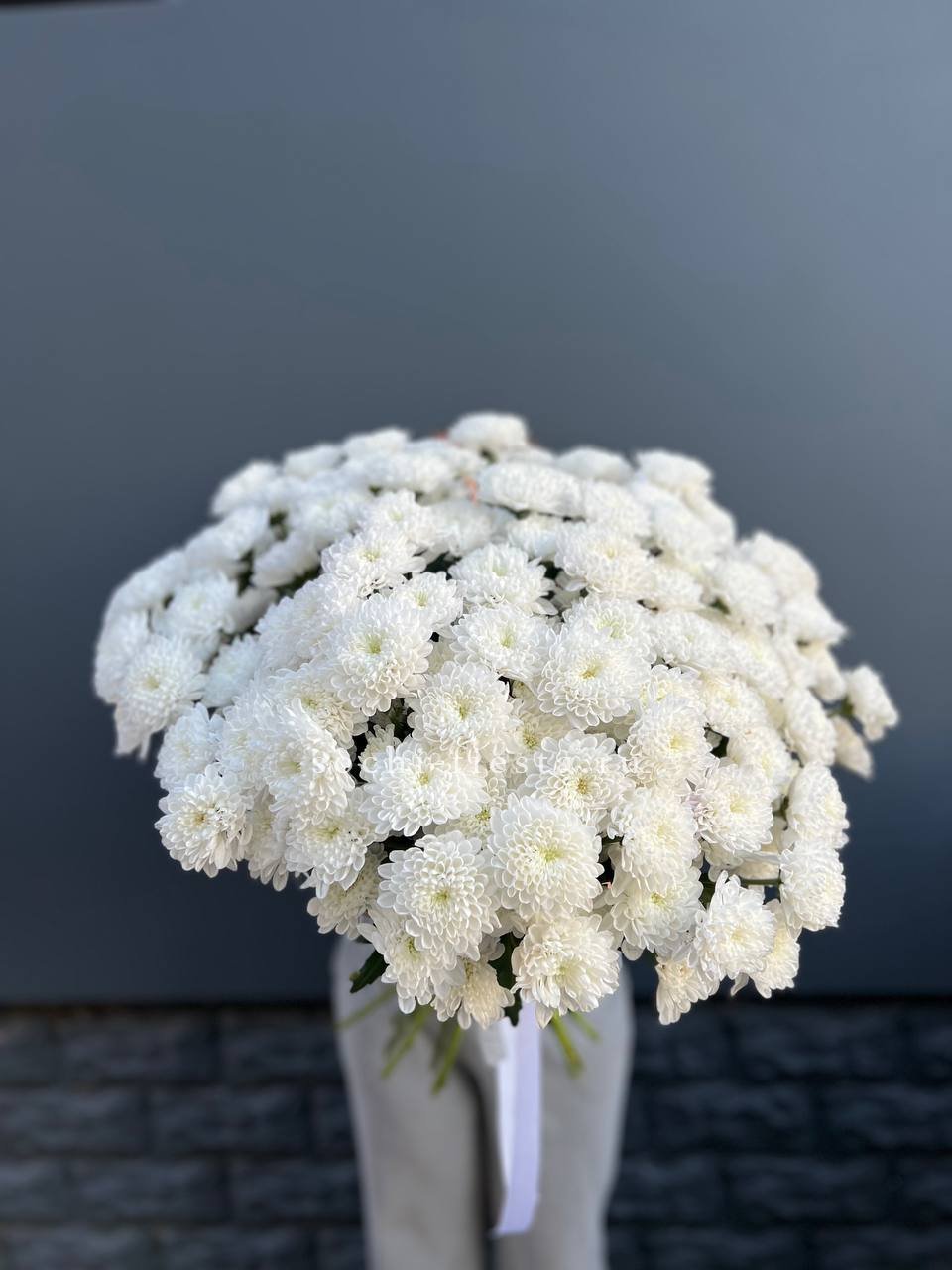 Семь хризантем Palermo образуют лаконичную композицию с чёткими линиями. Крупные соцветия раскрываются широко, заполняя пространство мягкими округлыми формами и создавая ощущение воздушной полноты.
