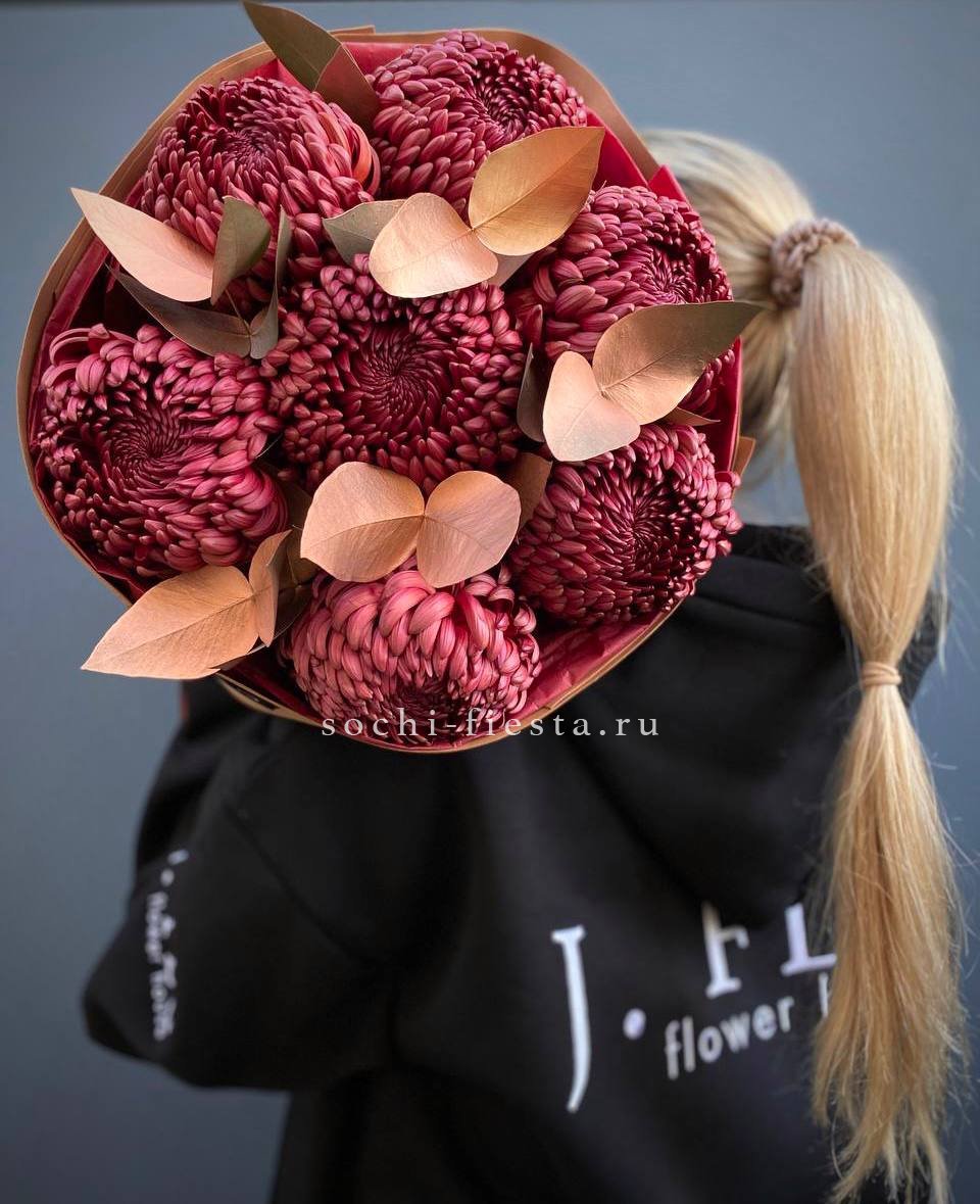 Теплый шоколадно-золотой оттенок хризантем создает уютное осеннее настроение. Семь пышных соцветий собраны в компактную композицию с веточками эвкалипта.
