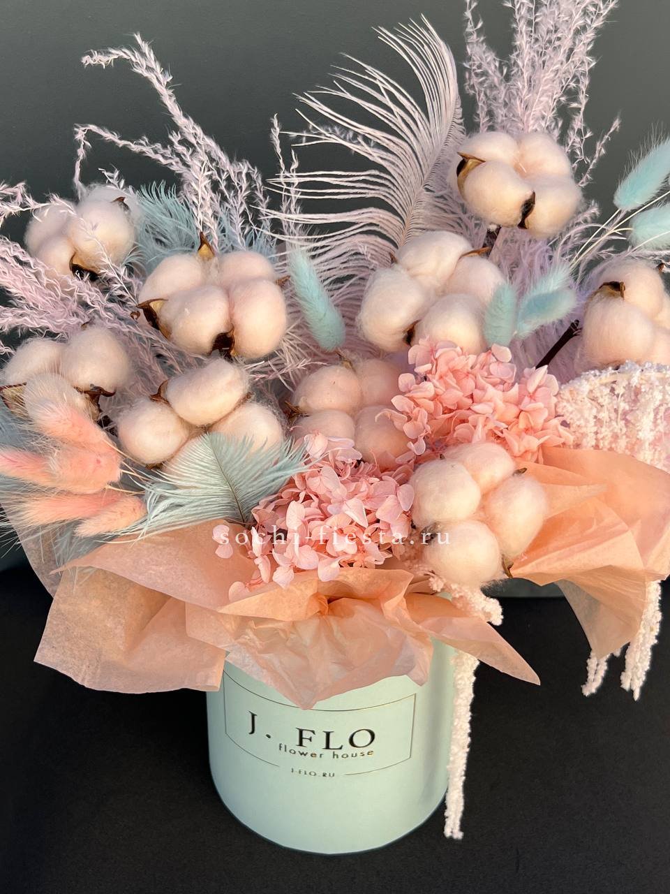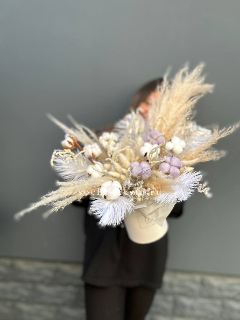 Бокс с природными текстурами: мягкость хлопка, воздушность лагуруса и графичность амаранта. Перья добавляют легкости. Композиция держит форму и не теряет выразительности со временем.