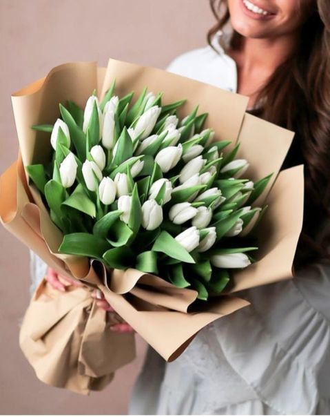 Сто один белоснежный тюльпан собран в плотную охапку с безупречной геометрией. Классическая упаковка сохраняет естественную красоту бутонов и подчёркивает масштаб композиции.