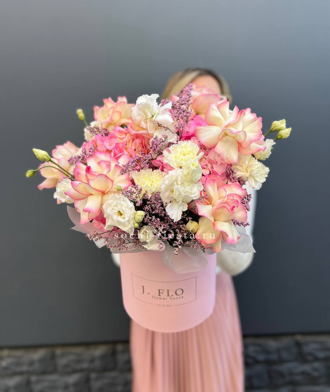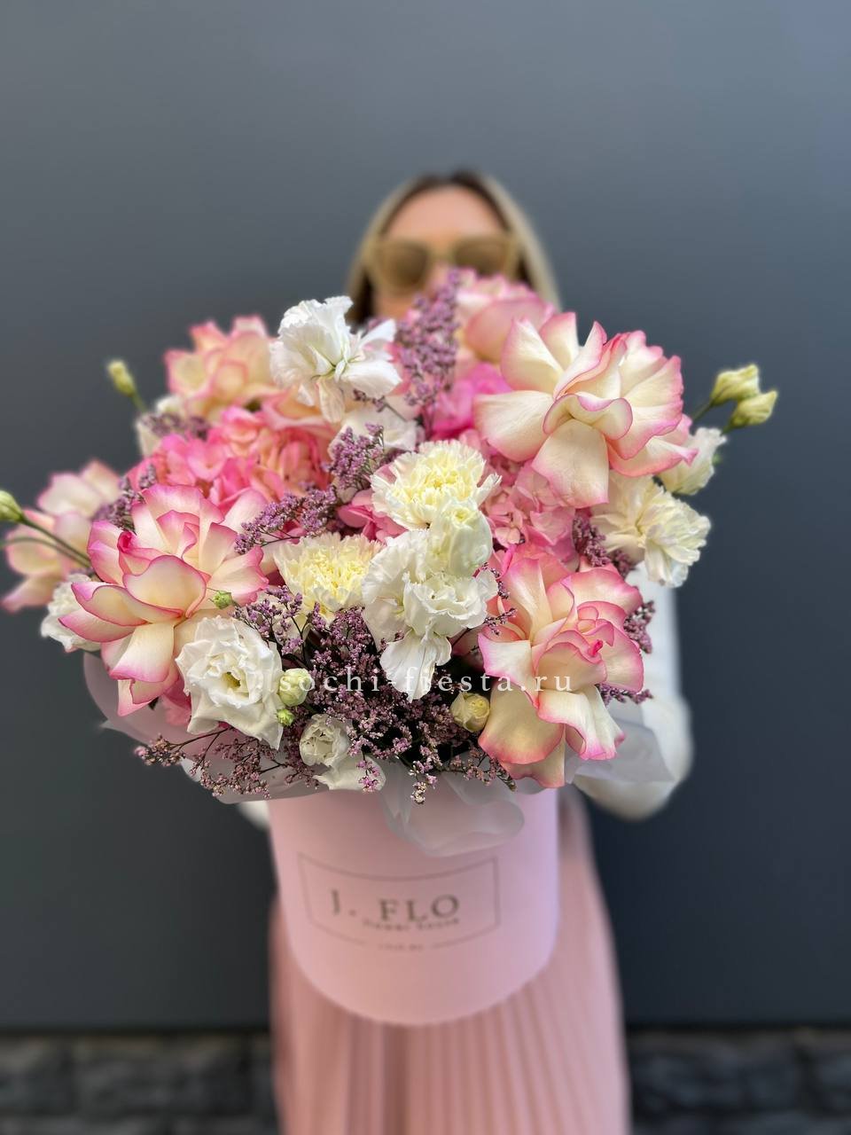лилии, диантусы, статица, пионы или замена в не сезон эвкалипт, цилиндр.Состав может меняться в зависимости от сезона.