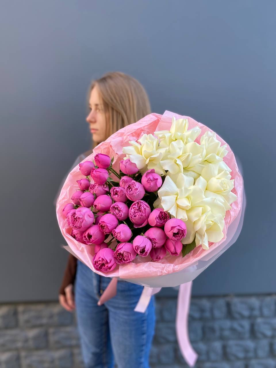 Пионовидные бутоны мисти баблс раскрываются мягкими волнами, создавая объёмную текстуру рядом с классическими белыми розами. Букет построен на игре плотности: пышные головки чередуются с точёными силуэтами, собирая взгляд к центру композиции.