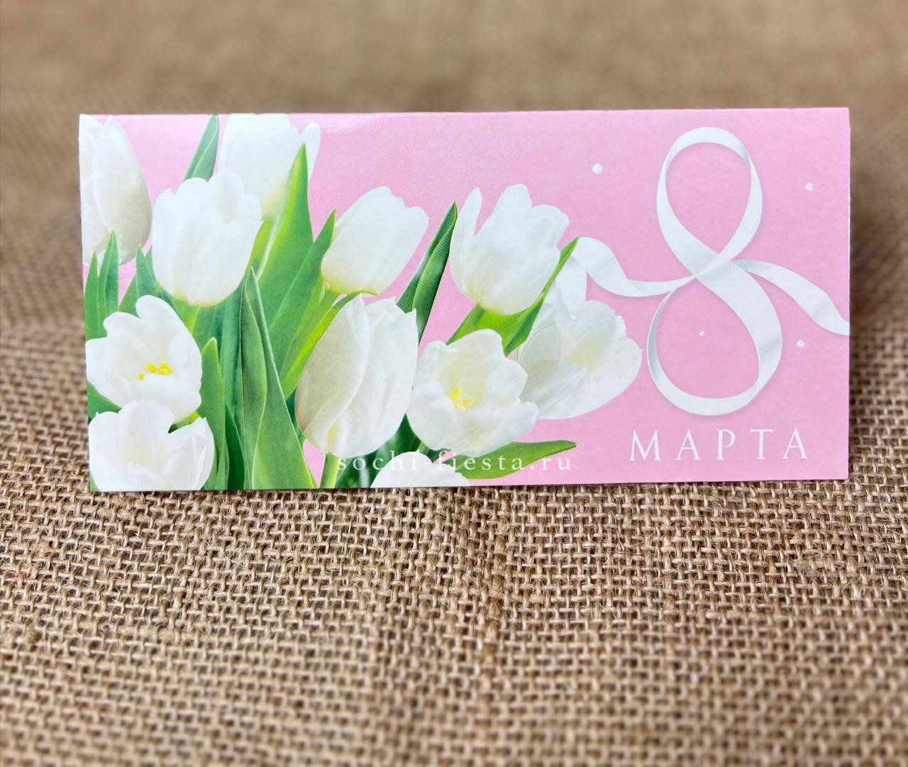Лаконичный конверт с весенним оформлением для денежного подарка. Практичное дополнение к букету в формате классической поздравительной традиции.