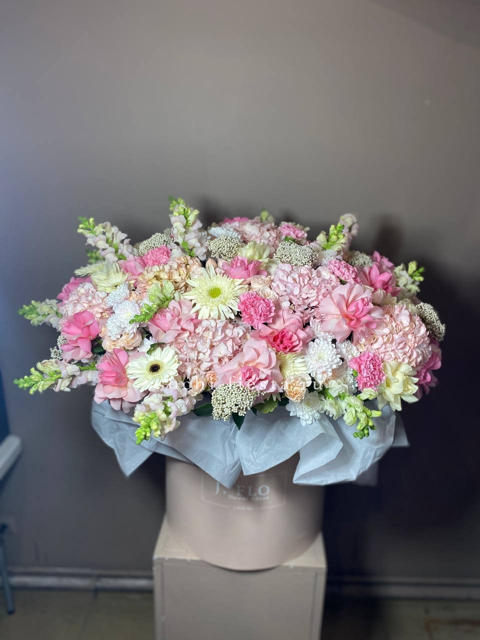 Масштабная композиция объединяет хризантемы, герберы, розы, антиринум и гортензию в плотную структуру с яркими акцентами. Диантус и бомбастик добавляют объем, а озотамус создает текстурные переходы между крупными соцветиями.