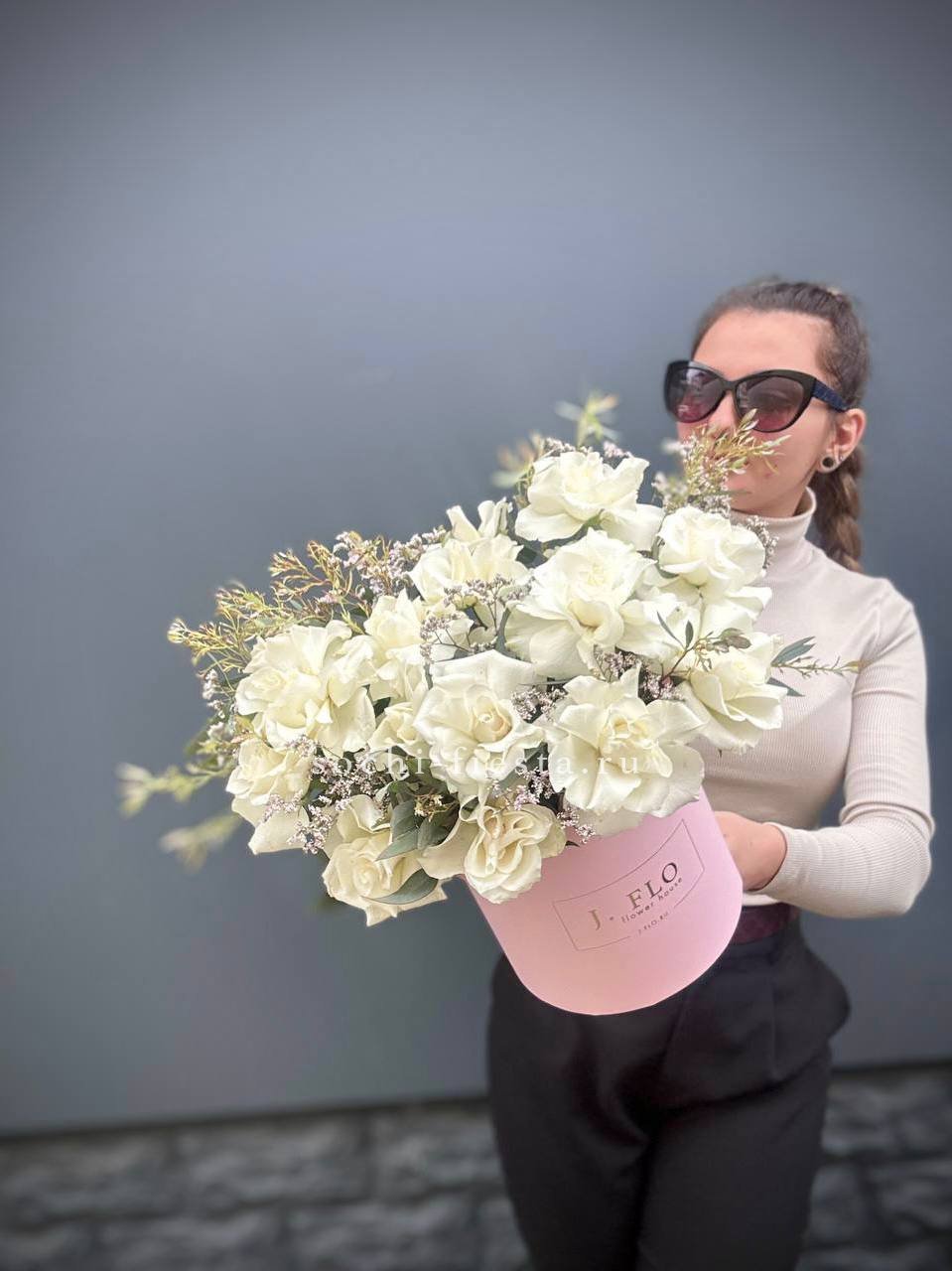Для заказа товара "17 Французских белых роз в коробке Афина" с доставкой в Сургуте нажмите в корзину