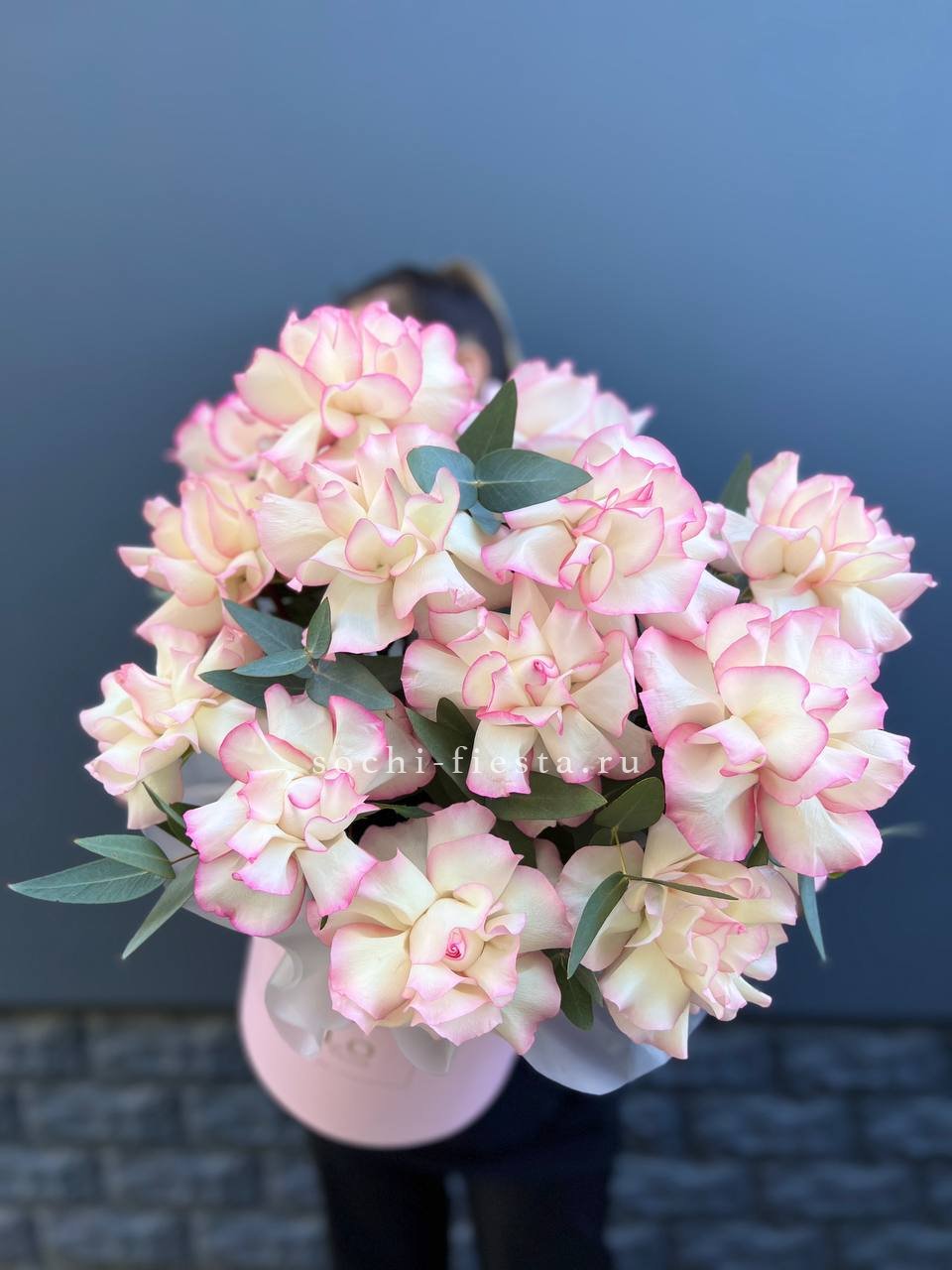 пионовидная кустовая роза бомбастик - 31 веточек, эвкалипт, лента, цилиндр D20.