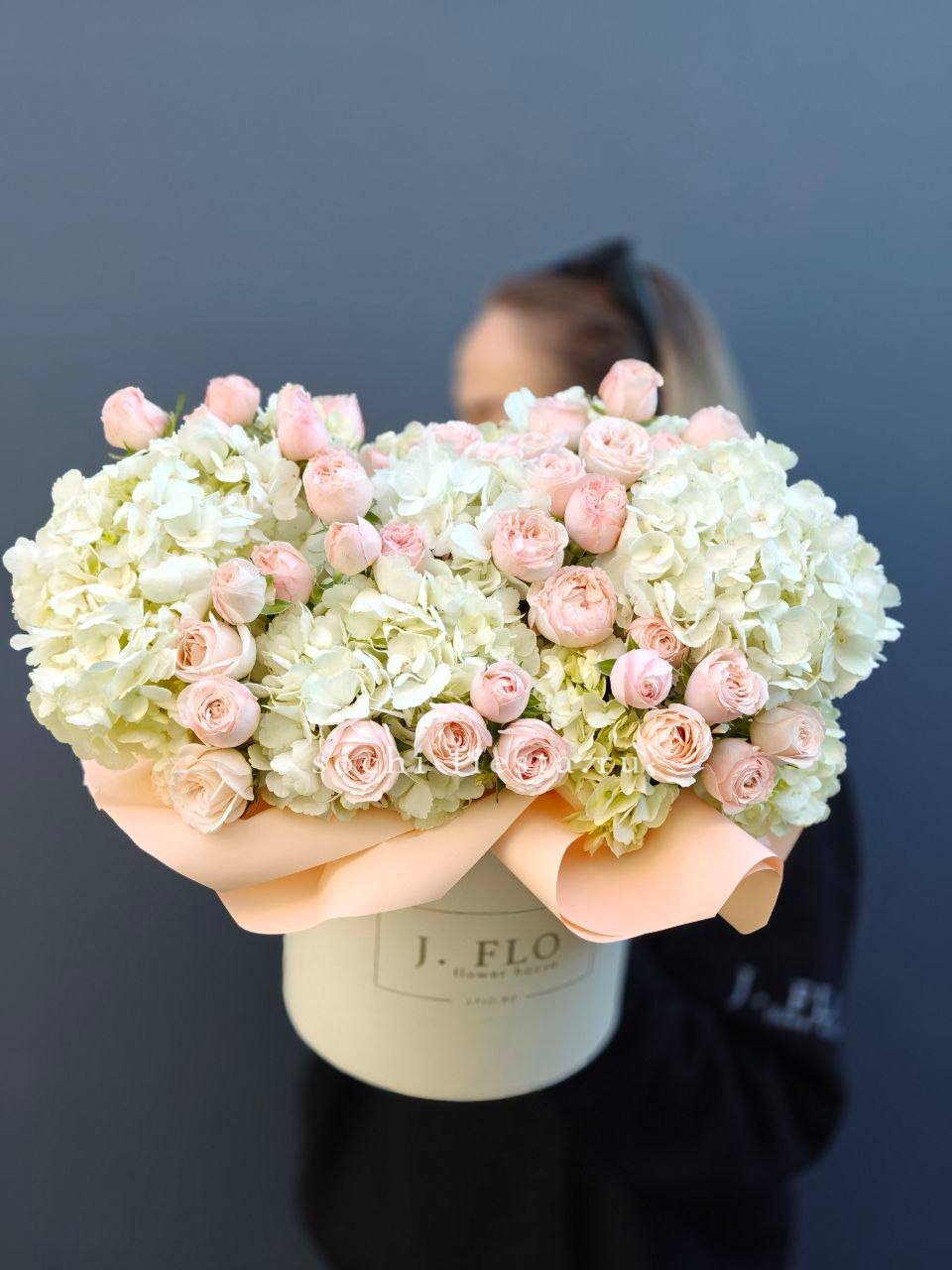 Пионовидные бутоны и шапки гортензии заполняют бокс густой textured массой. Композиция держит форму и создаёт ощущение цветочной волны в ограниченном пространстве.