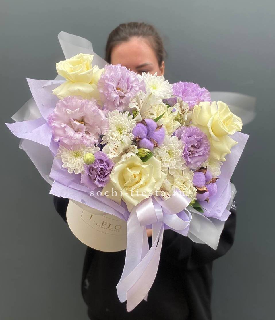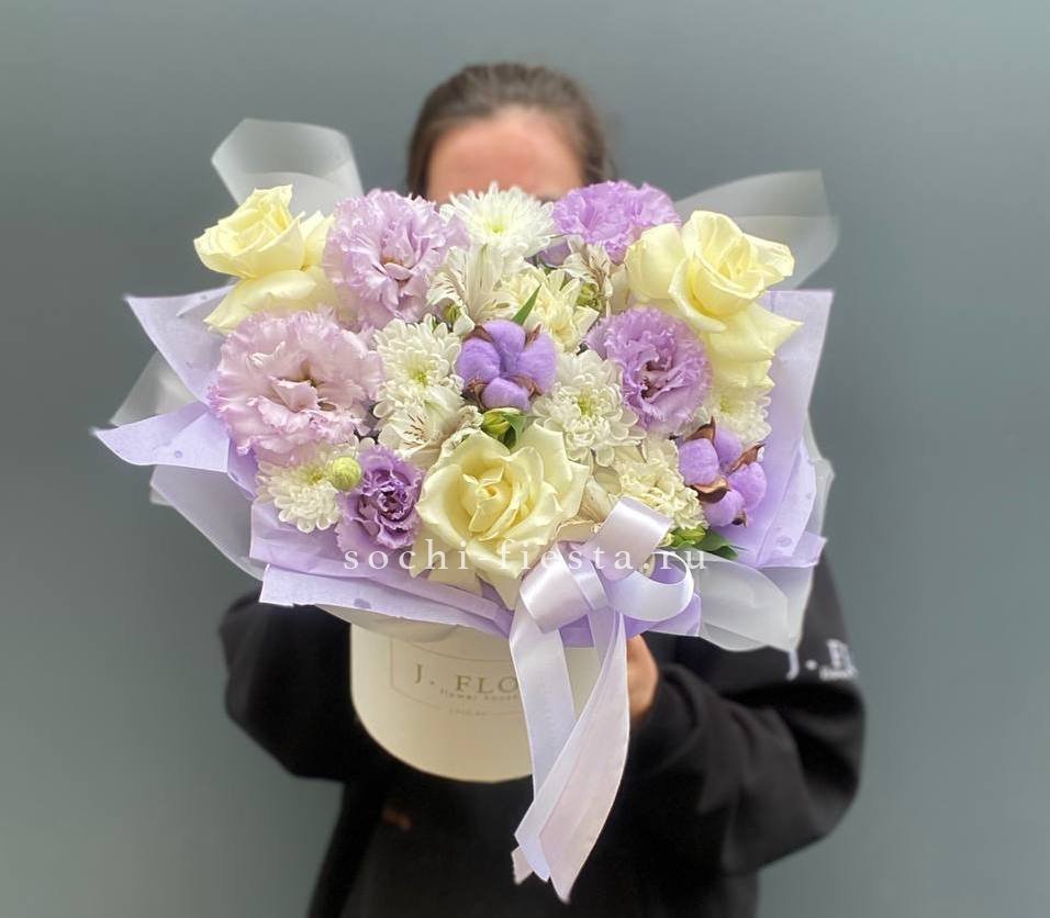сборный нежный бокс из хризантемы, хлопка, герберы и эустомы.