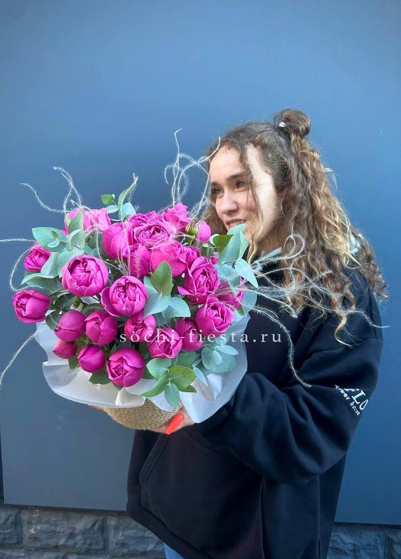 Для заказа товара "Пионовидные розы в джутовом кашпо " с доставкой в Сургуте нажмите в корзину