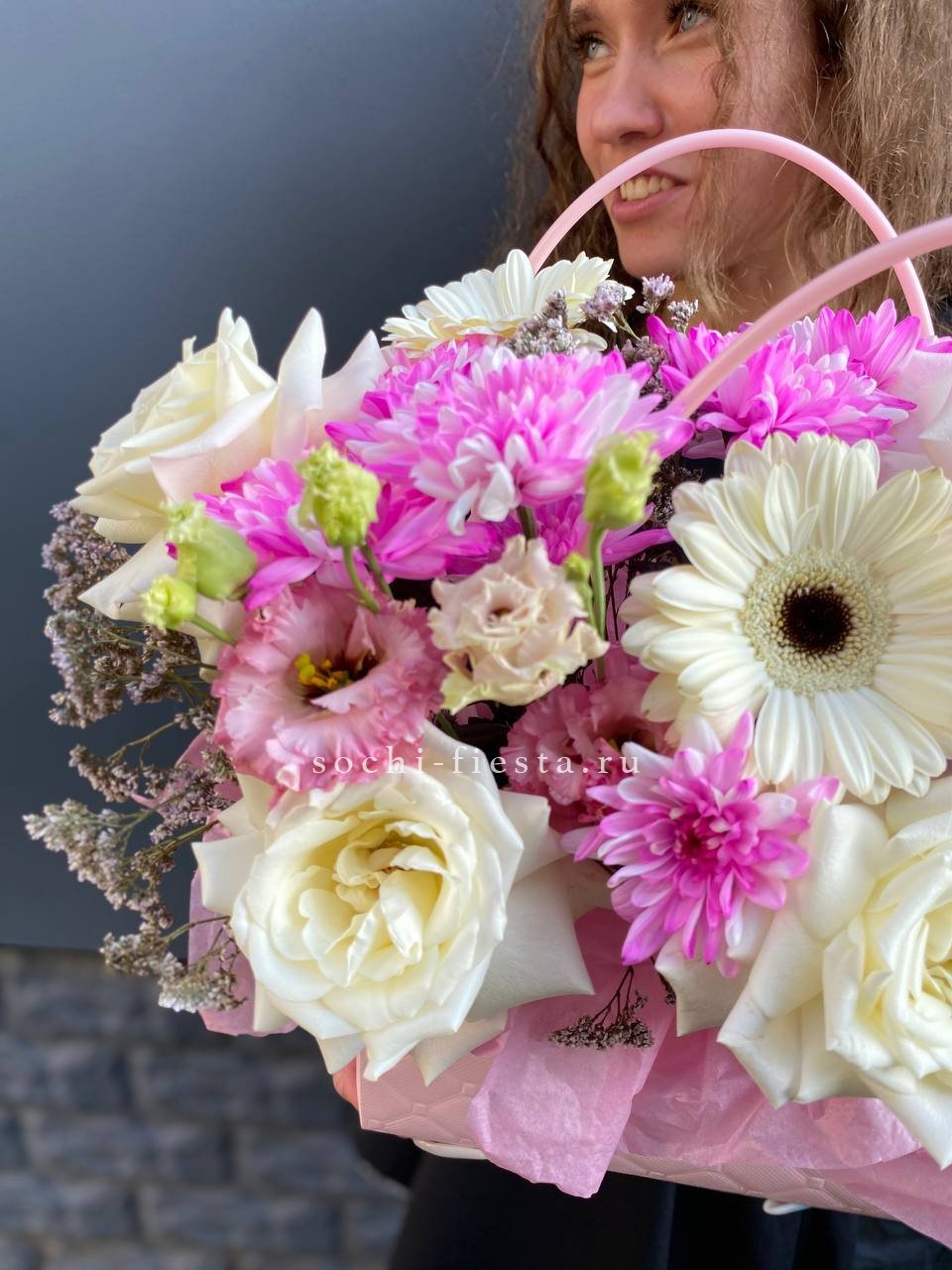 Герберы задают ритм композиции яркими пятнами среди белых роз и кустовой хризантемы. Лимониум заполняет объём воздушной текстурой. Сумка-кашпо удерживает форму и позволяет поставить букет без дополнительной вазы.