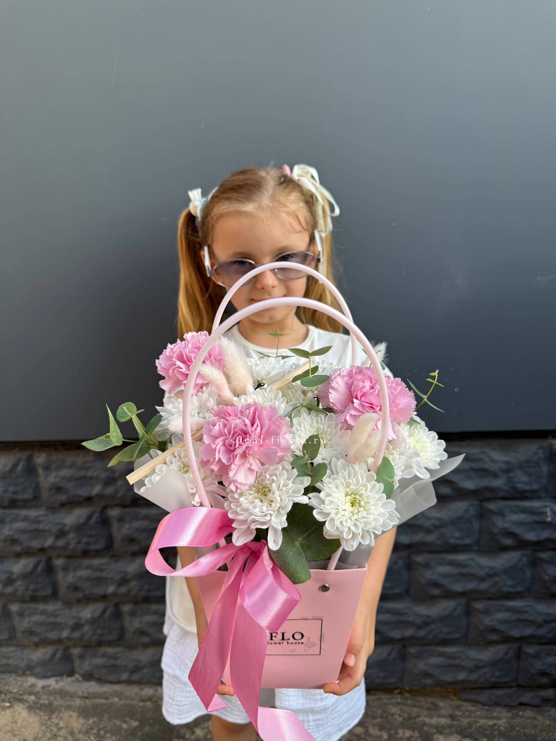 Белоснежные розы переплетаются с воздушной эустомой и раскрытыми лилиями в аккуратной цветочной сумке. Эвкалипт создаёт прохладный фон для светлых бутонов. Композиция на оазисе сохраняет свежесть и форму долгое время.