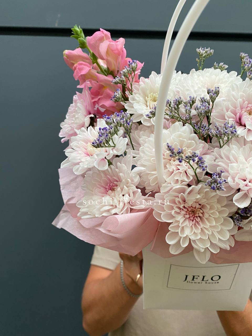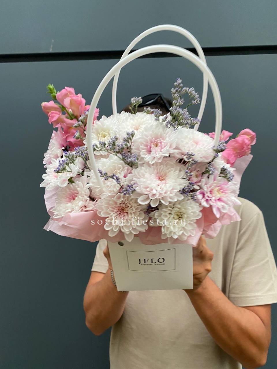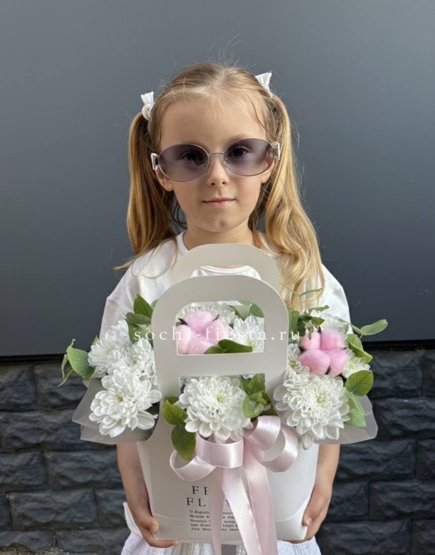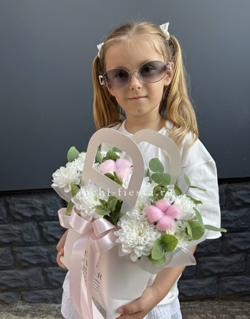 гортензия, джумилия, гербера, сумочка.
