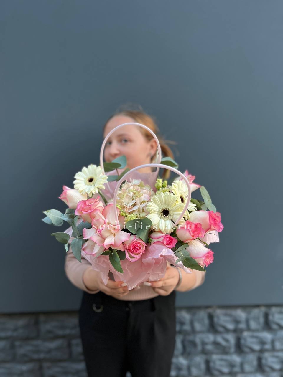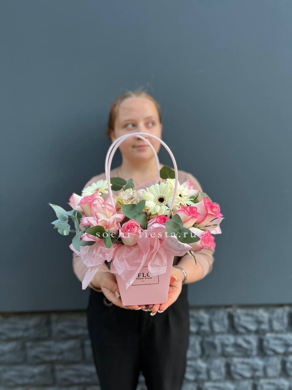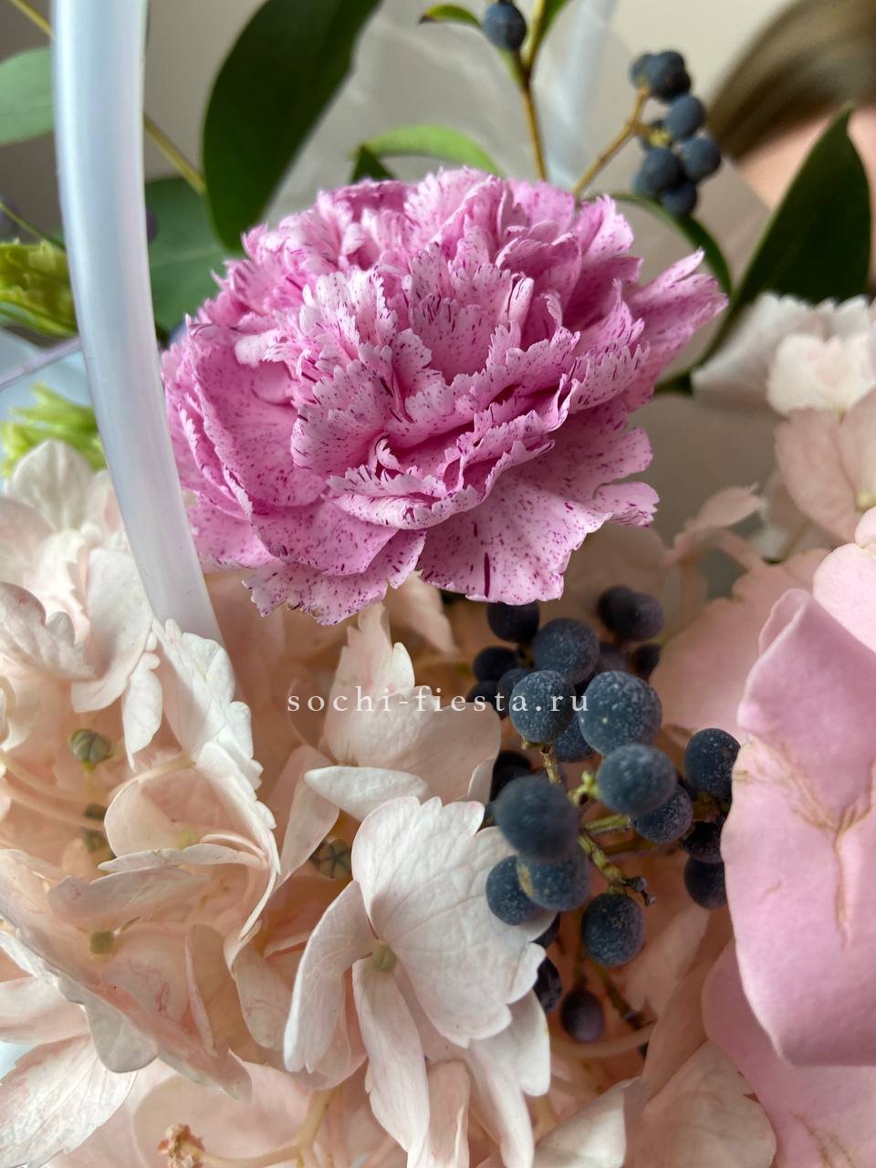 гортензия, джумилия, гербера, сумочка.