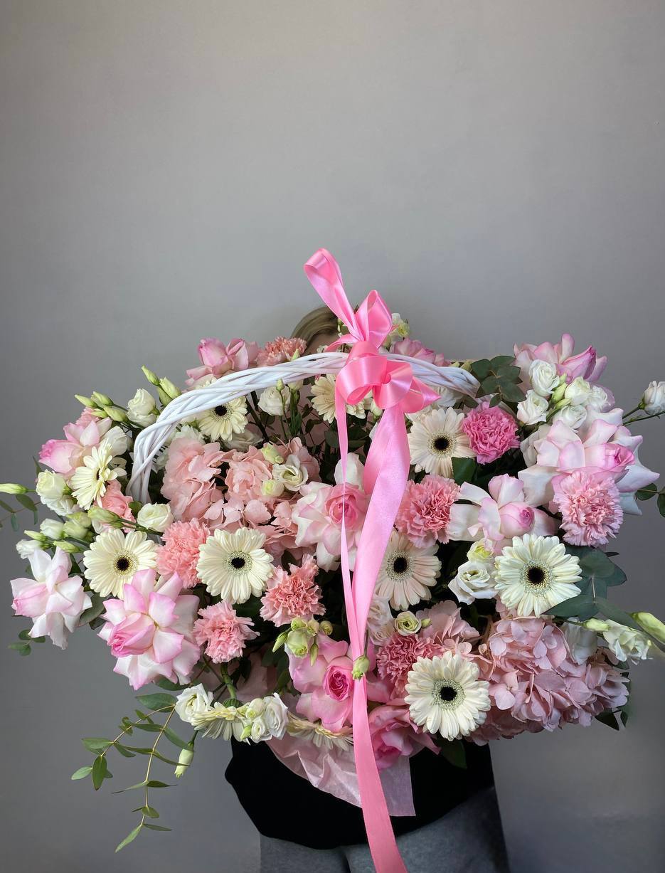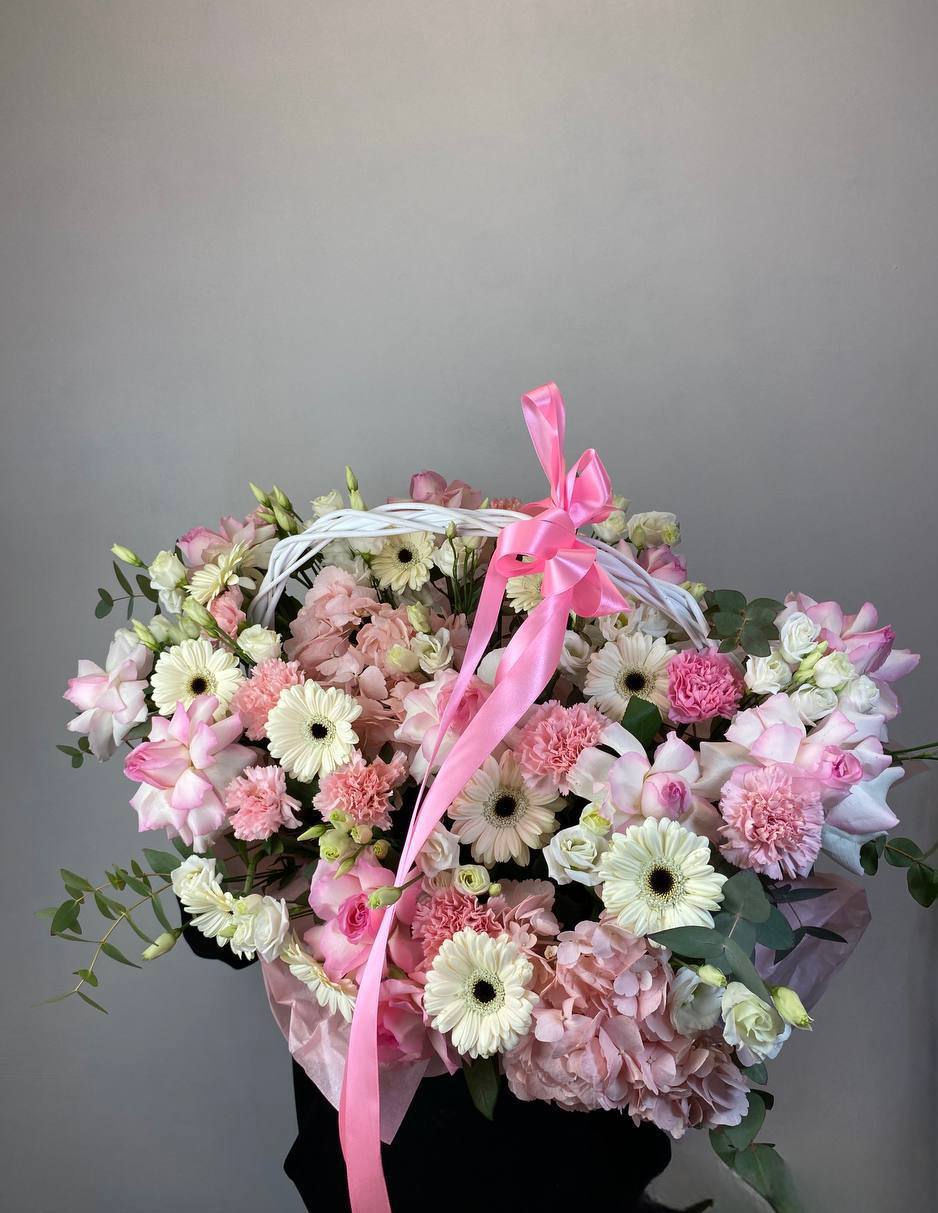 Пышная корзина с бархатными гортензиями и розами разных форм создает живописную композицию в романтичной гамме. Альстромерии и диантусы добавляют воздушности между крупными соцветиями.