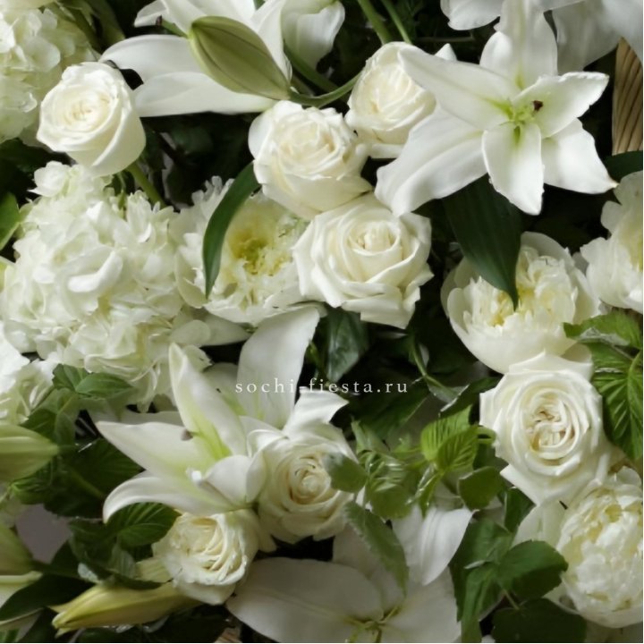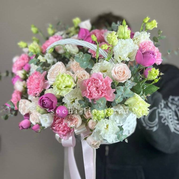 Состав корзин в Сургуте определяется текущими поставками и сезоном. Розы Freedom, Mondial, Cappuccino — для классических куполообразных аранжировок. Пионы в мае-июне из свежих поставок: Sarah Bernhardt, Red Charm, Bowl of Cream — главный сезонный продукт. Хризантема, альстромерия, гербера — для объёмных торжественных наполнений. Эустома, ранункули — для садовых корзин. Флорист строит состав под конкретный запрос.