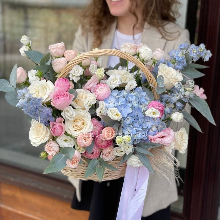 Садовая корзина — главный тренд последних лет. Свободная многовидовая аранжировка в плетёной корзине: эустома, ранункули, нигелла, зелень — ощущение только что срезанных цветов из загородного сада. Покупают те, кто устал от строгих классических форматов и ищет природной органики и лёгкости в подарке.