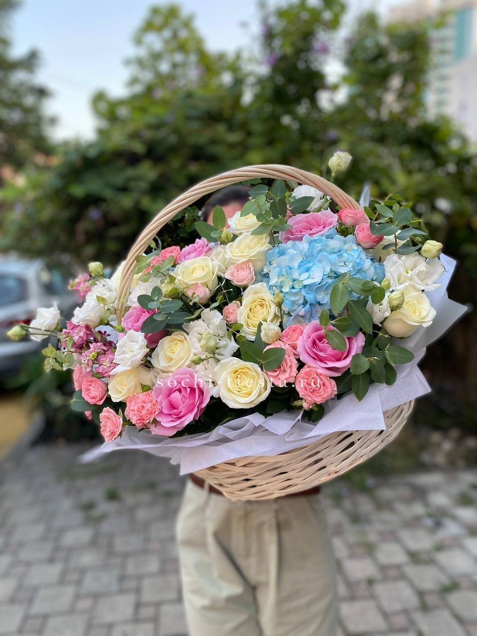 розы, эустома, гортензия, бомбастик, маттиола ( или аналог), эвкалипт, корзина.