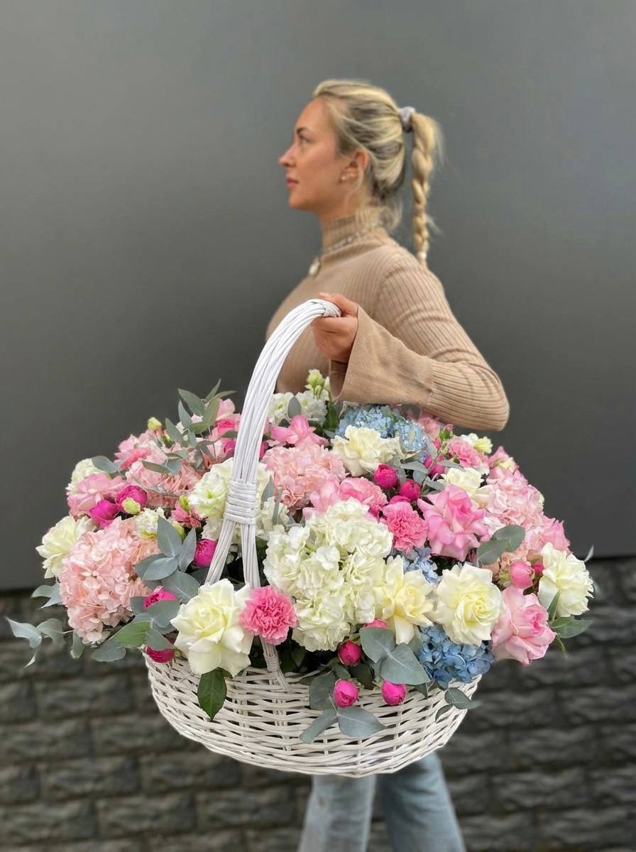 цветочная корзина с розами, мисти баблс, диантусами и гортензией.