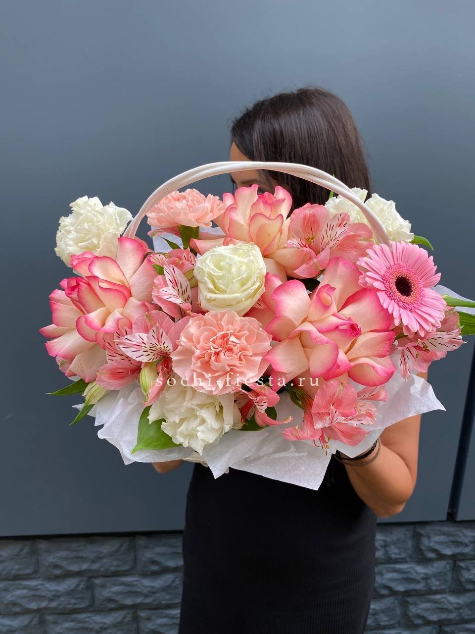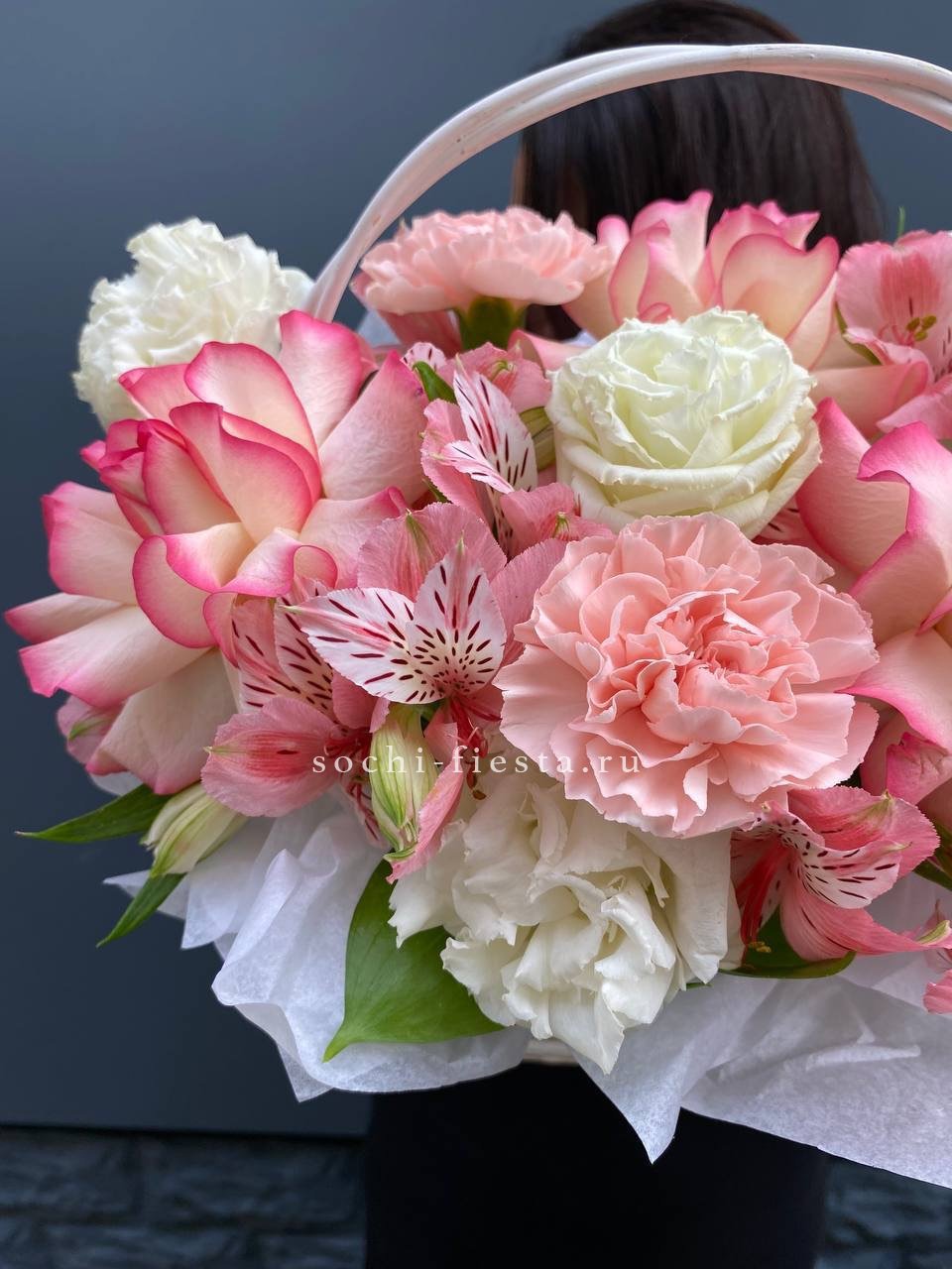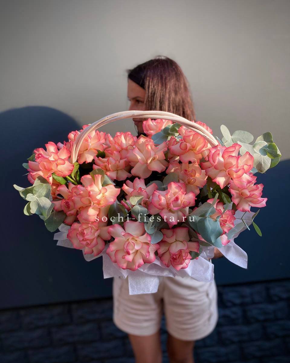орхидея, гортензия, эустома, роза, эвкалипт, альстромерия, лента, корзина.