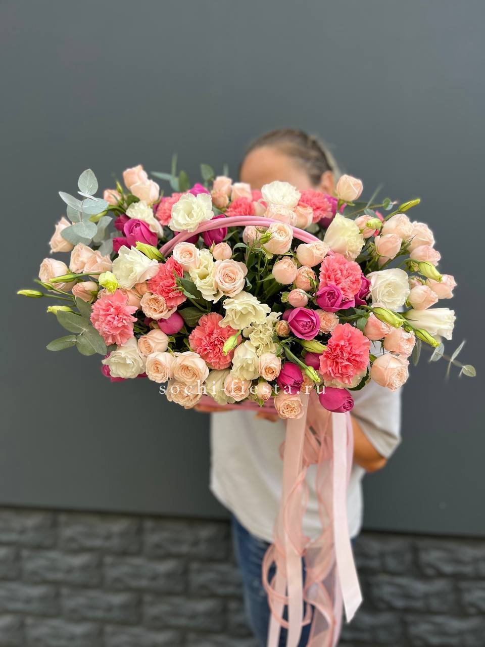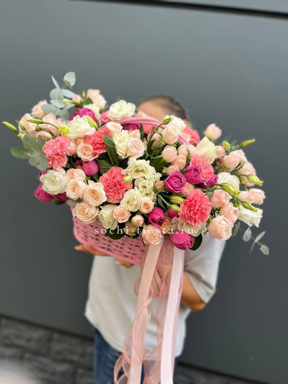 Пышная композиция в корзине собрана из роз двух видов и воздушной эустомы в бело-розовой гамме. Фисташка добавляет свежести, а округлая форма создает ощущение наполненности и объема.