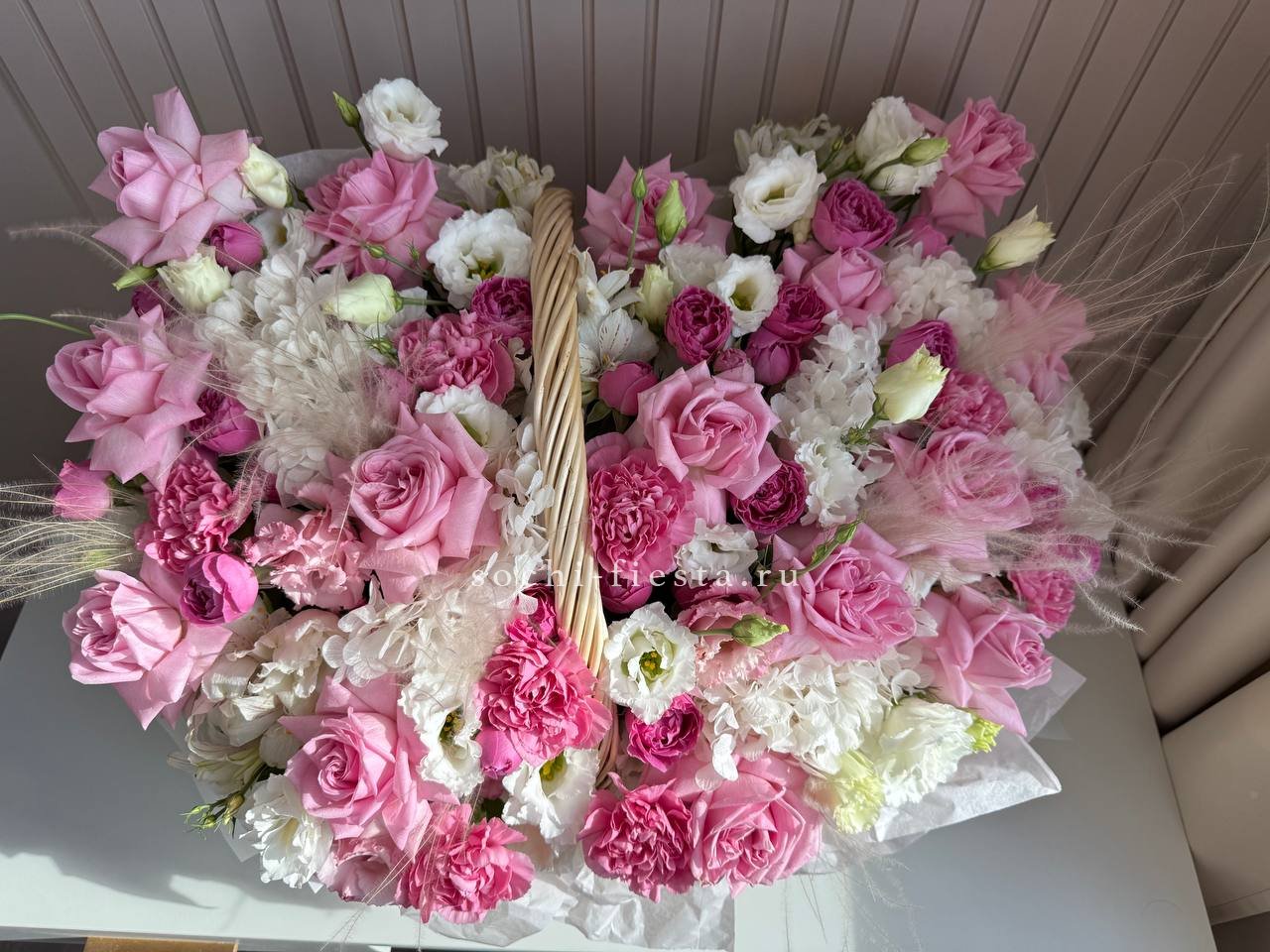 роза одноголовая, роза пионовидная, альстромерия, эустома, гортензия, ковыль, диантус, плетеная корзина.