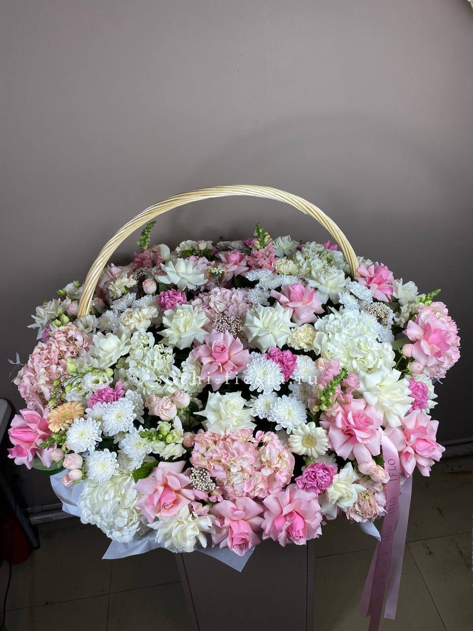 Здесь идеально сочетаются крупные, бархатистые бутоны роз, облака гортензии и мелкие акцентные цветы. Получилась невероятно воздушная и легкая композиция, которая мгновенно создает ощущение праздника и весеннего настроения. Стильный бант завершает этот изысканный образ.