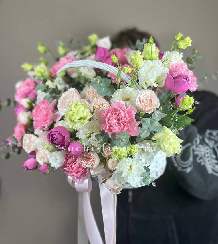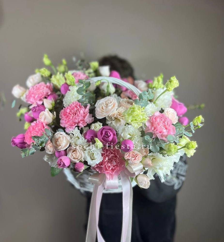 герберы, рзовая роза, диантус, озотамус, мисти баблс, бомбастиу, корзина малая.