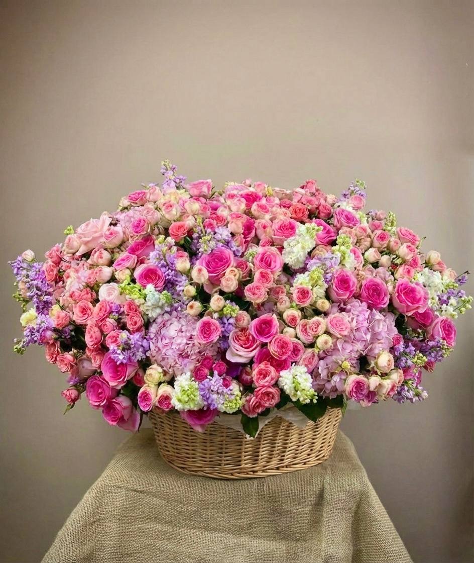 Двадцать пять французских роз с крупными бутонами и бархатистыми лепестками уложены в плетёную корзину. Натуральная основа придаёт композиции домашнее тепло и завершённость формы.