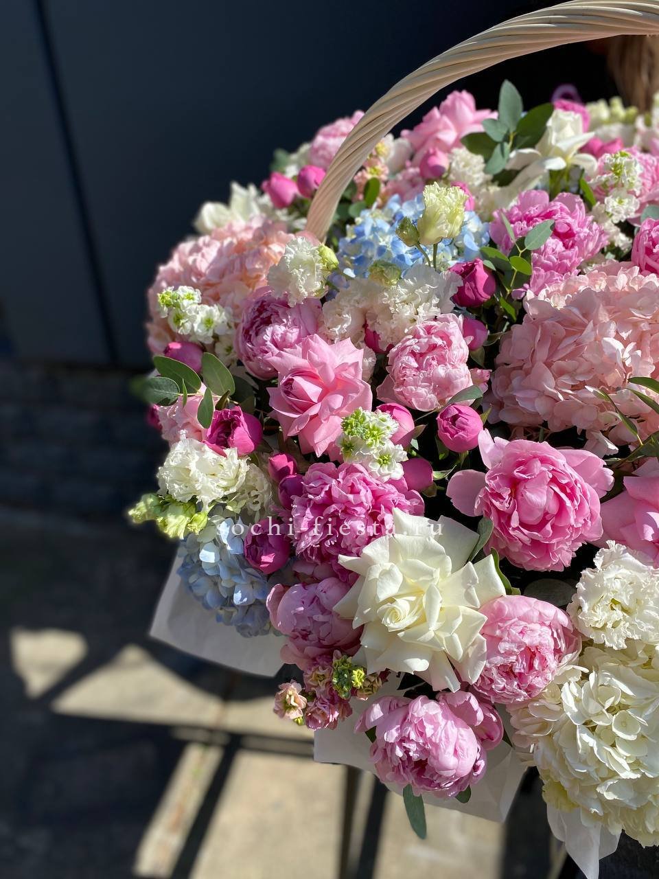 Плетеная корзина вмещает густую композицию из лилий с добавлением эвкалипта. Объемная форма создает впечатление цветущего сада, собранного в одном месте.
